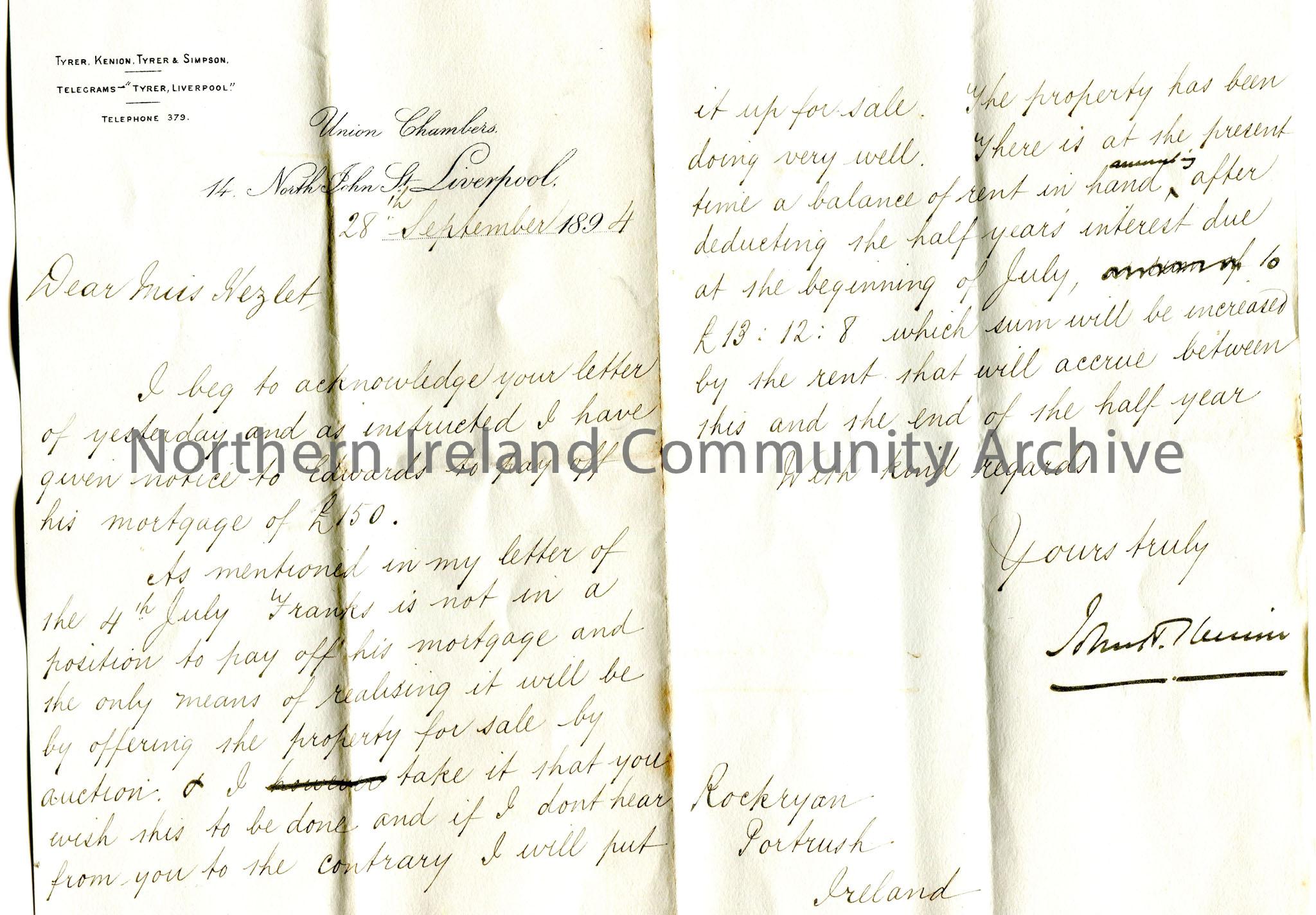 Handwritten letter to Miss Hezlet at Rockryan, Portrush, Ireland. Edwards to pay off his mortgage of £150. Franks cannot pay off the mortgage on a property and so may have to be put into auction for sale.