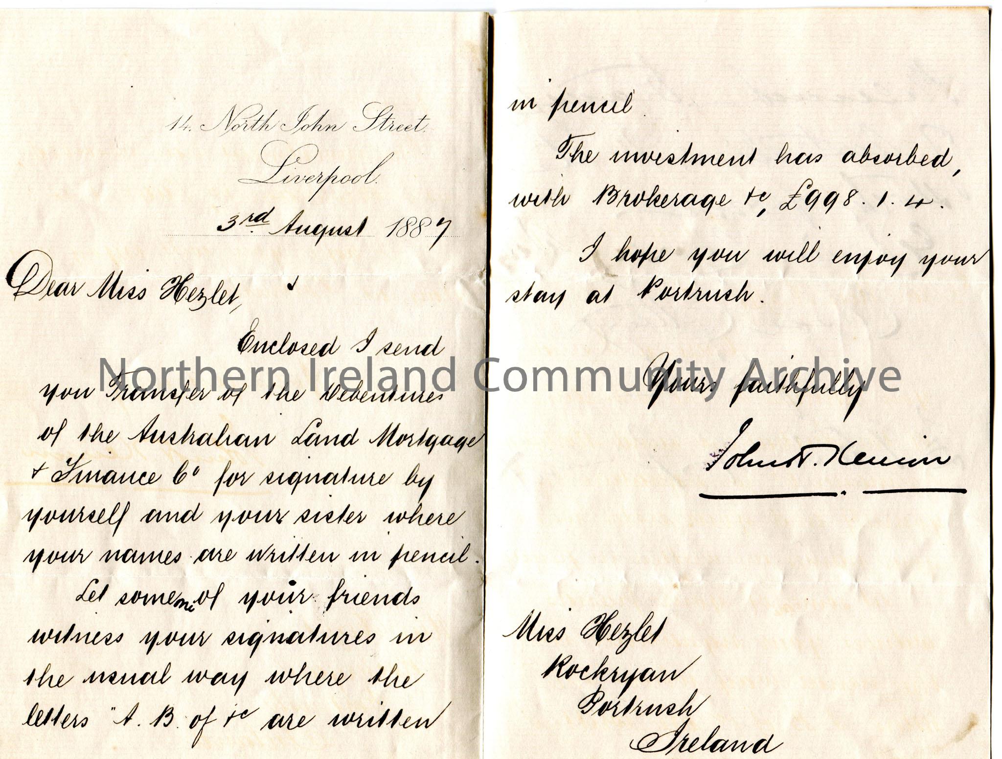 Handwritten letter to Miss Hezlet at Rockryan, Portrush, Ireland. Encloses transfer of the Debentures of the Australian Land Mortgage and Finance Company to be signed by Miss Hezlet and her sister. The investment amounts to £998.1.4. Hopes Miss Hezlet enjoyed her stay in Portrush. Notes on reverse re transfer of Australia mortgage stock.