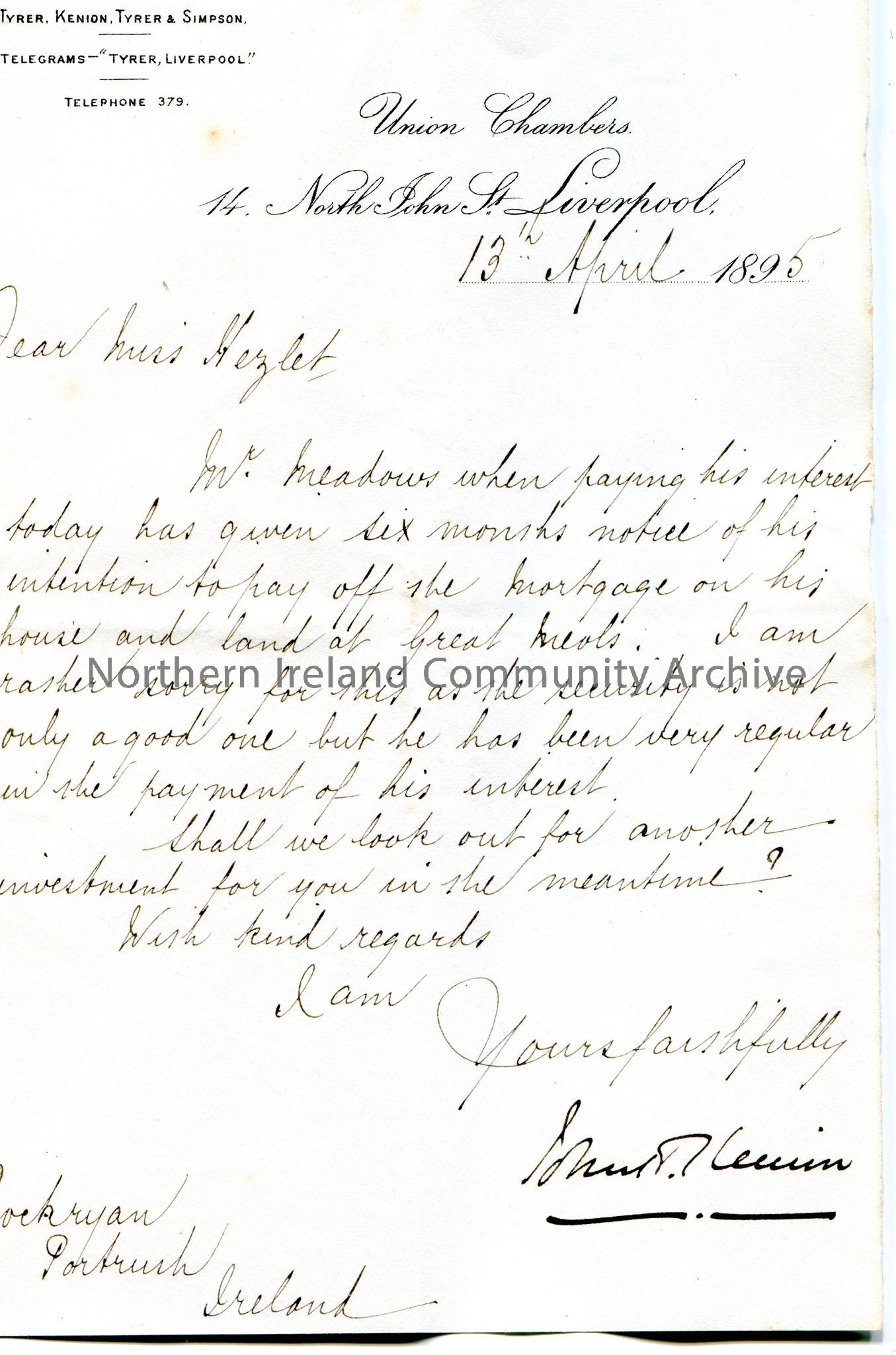 Handwritten letter to Miss Hezlet at Rockryan, Portrush, Ireland. Informing Miss Hezlet that Mr Meadows is to pay off the rest of the mortgage at Great Meols.