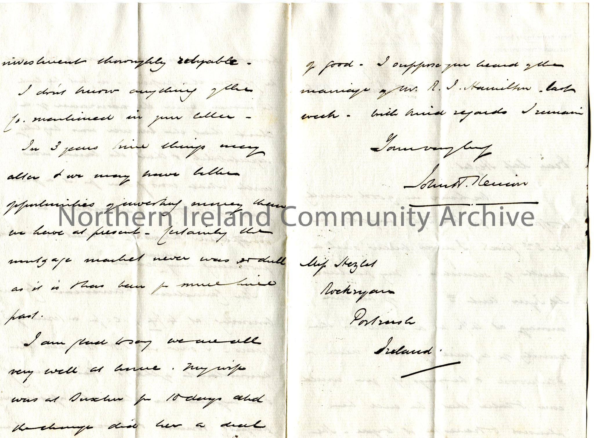 Handwritten letter to Miss Hezlet at Rockryan, Portrush, Ireland. Informs there are no good securities for her £900. Suggests investment in a pie… – scan426b