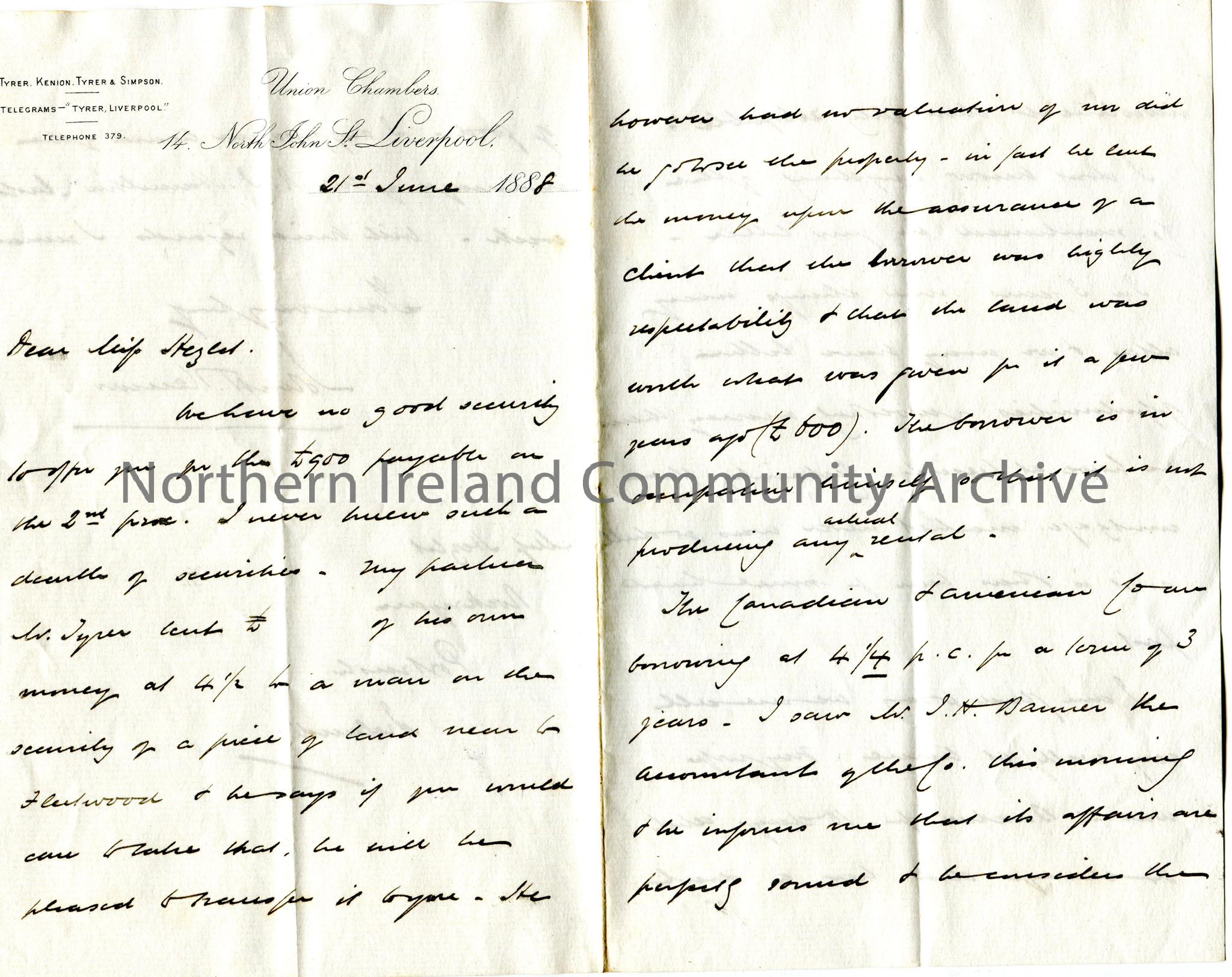 Handwritten letter to Miss Hezlet at Rockryan, Portrush, Ireland. Informs there are no good securities for her £900. Suggests investment in a piece of land near to Fleetwood owned by Kenion's partner W. Tyrer. Refers to the accountant of the Canadian and American Company J. H. Banner? Comments on how bad the market is for securities at the moment.