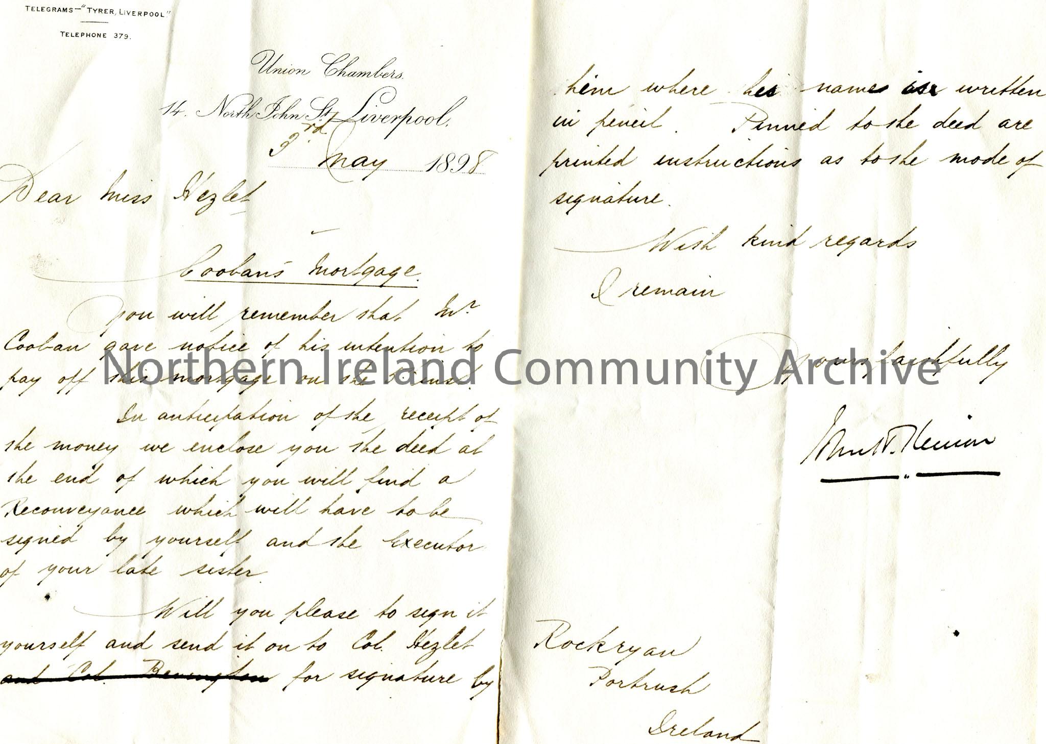 Handwritten letter to Miss Hezlet at Rockryan, Portrush, Ireland re Coolan's mortgage. Mr Coolan has intended to pay off his mortgage on the 5th. The deeds are enclosed and Miss Hezlet and Col. Hezlet are to sign.