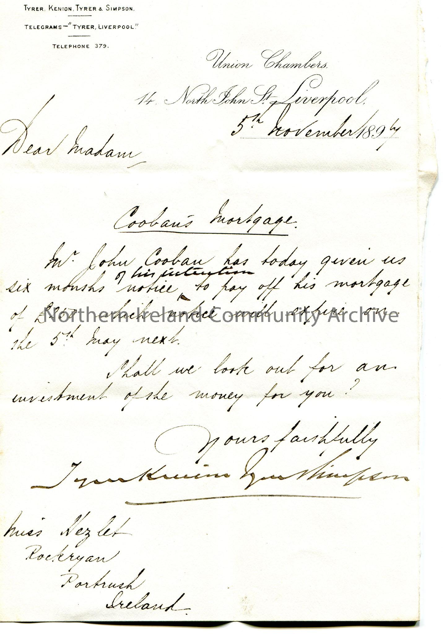 Handwritten letter to Miss Hezlet at Rockryan, Portrush, Ireland. Re Coolan’s Mortgage. Mr John Coolan has given them six months to pay off his mortga…