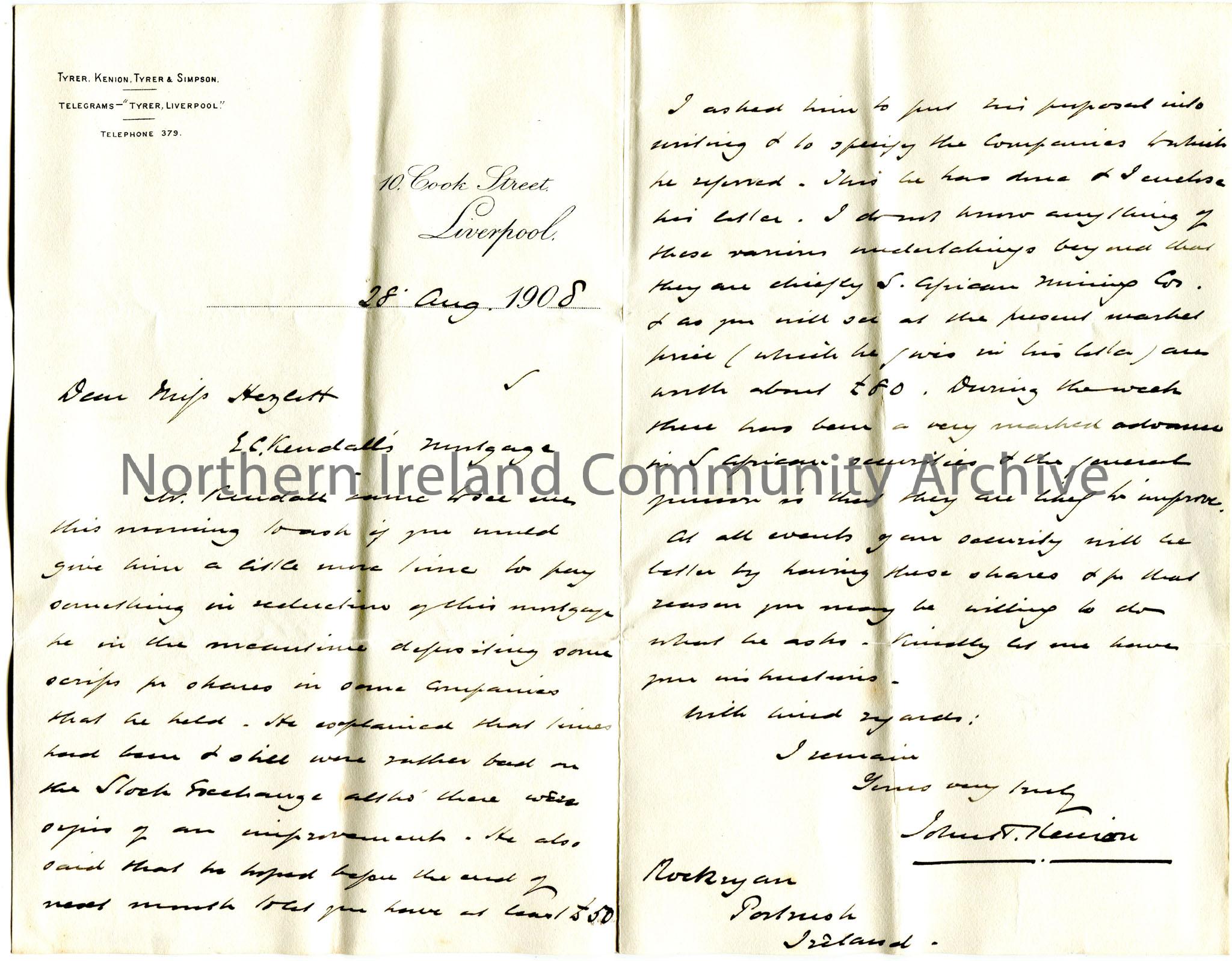 Handwritten letter to Miss Hezlet at Rockryan, Portrush, Ireland re E.C.Kendall's Mortgage. Mr Kendall had asked Kenion to talk to Miss Hezlet re payment of the mortgage and he hoped before the end of next month she shoule have £50. Kendall to put his proposal in writing. Refers to South African Mining Company.