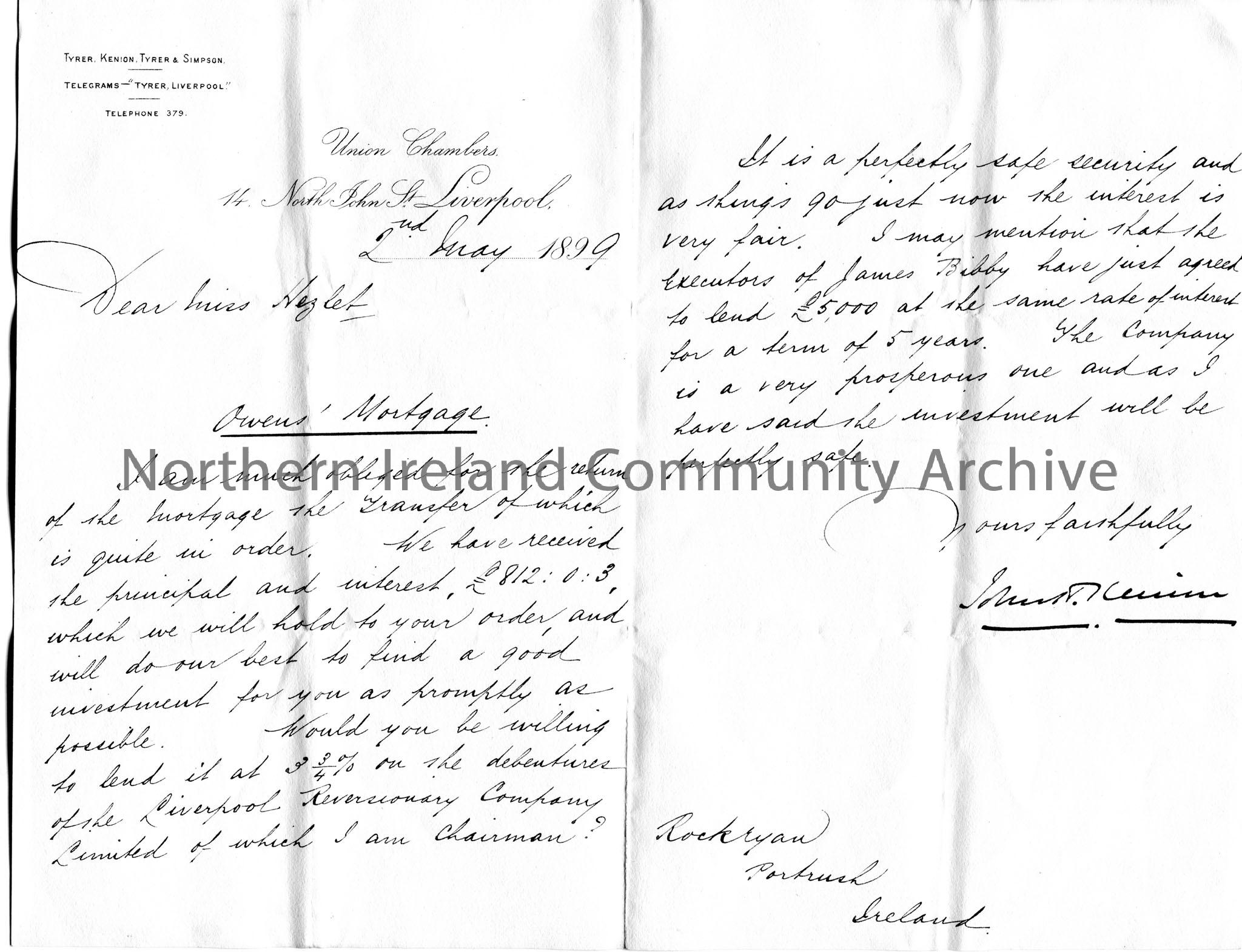 Handwritten letter to Miss Hezlet at Rockryan, Portrush, Ireland. Re Owen's Mortgage. Advising Miss Hezlet to invest her sum of £812.0.3, received from the return of the mortgage, in the Liverpool Reversionary Company Limited, of which Kenion is Chairman