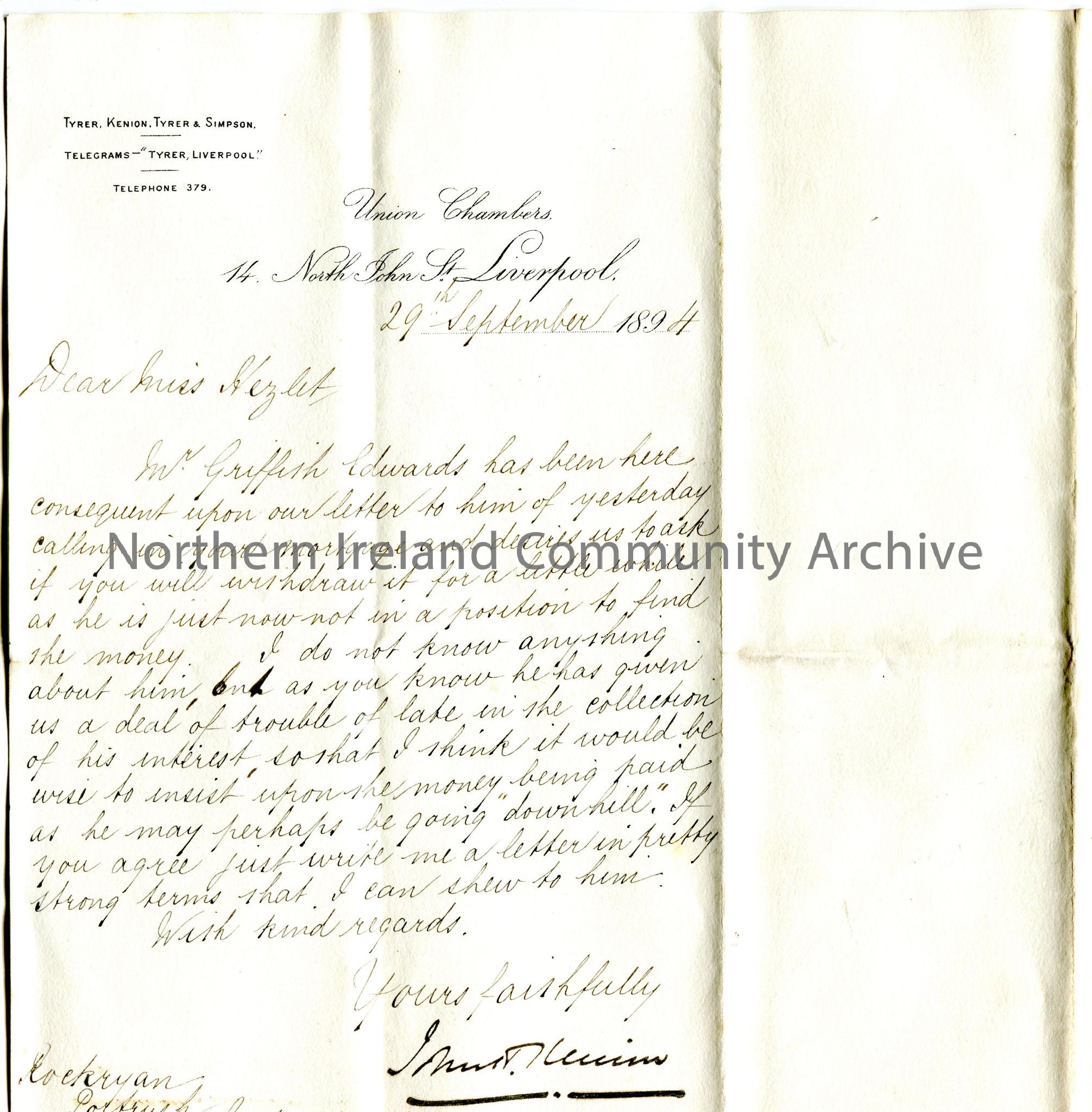 Handwritten letter to Miss Hezlet at Rockryan, Portrush, Ireland. Re W.Griffith Edwards is not in a position to pay the mortgage and has not been able to pay the interest . Kenion suggests asking for the money as he may be going 'downhill'. Miss Hezlet to write a strongly worded letter asking for the payments.