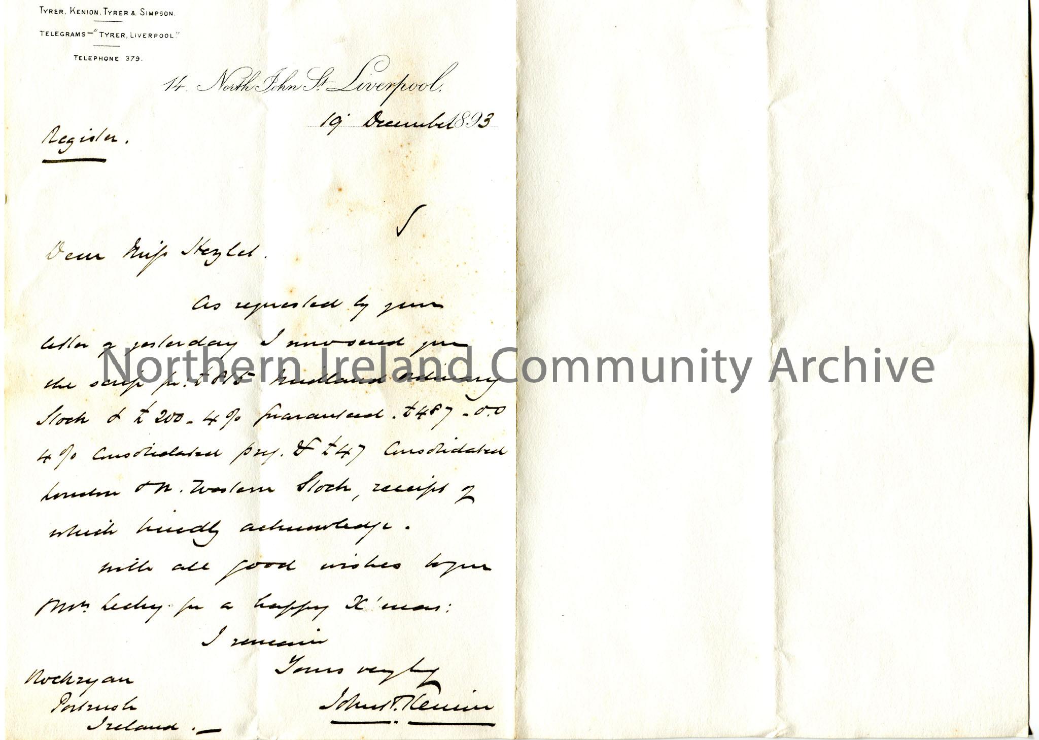 Handwritten letter to Miss Hezlet at Rockryan, Portrush, Ireland. Writes re the amount held with Midland Railway Stock; consolidated London and North Western Stock. Sends Christmas wishes to Miss Hezlet and Mrs Lecky.