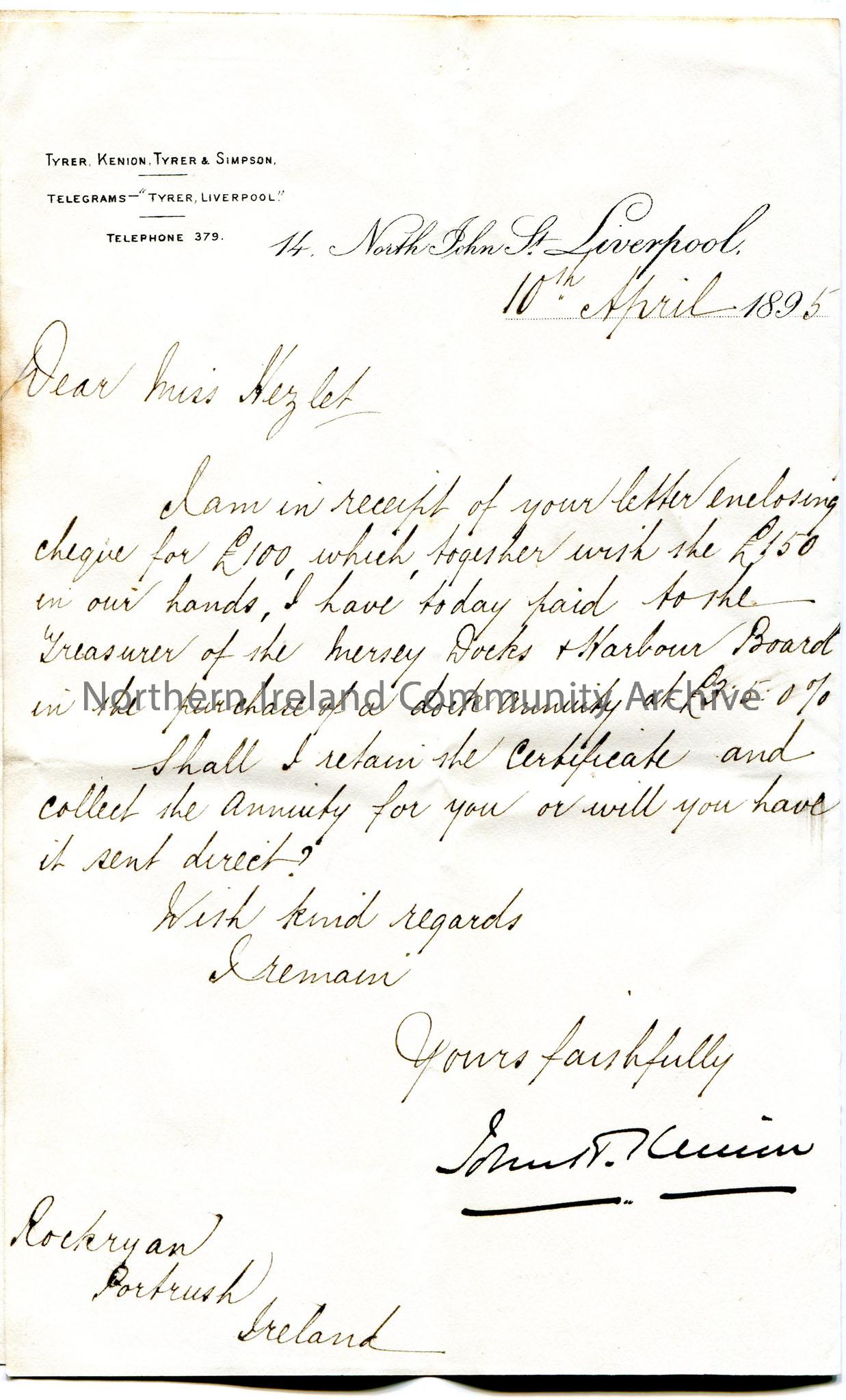 Handwritten letter to Miss Hezlet at Rockryan, Portrush, Ireland. Writing re Miss Hezlet's investment in the Mersey Docks Harbour Board in the purchase of a dock annunity.