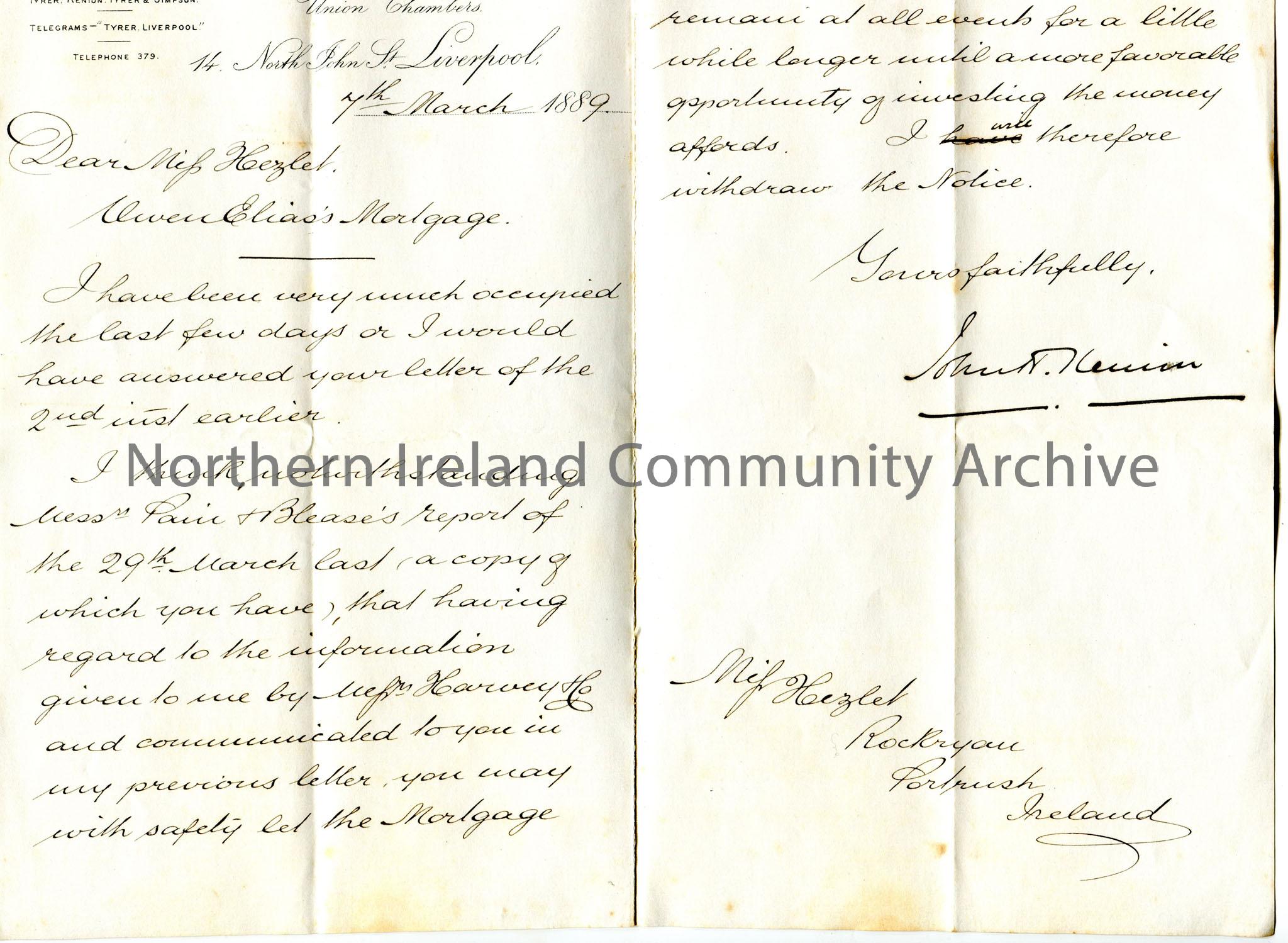 Handwritten letter to Miss Hezlet at Rockryan, Portrush, Ireland. Writing re Owen Elias’ Mortgage. Kenion recommends letting the money remain until a …