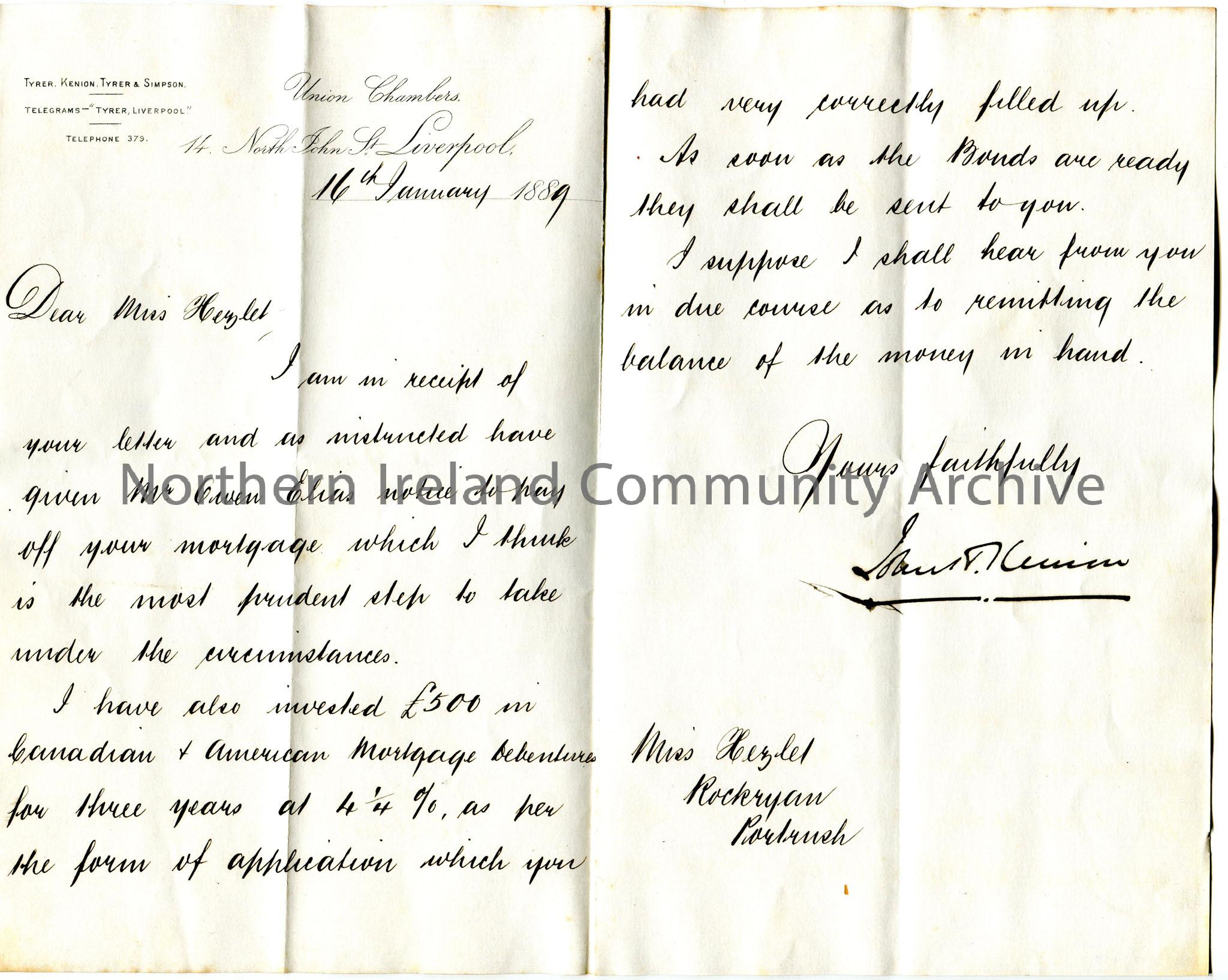 Handwritten letter to Miss Hezlet at Rockryan, Portrush. Mr Owen Elias has been given notice to pay off Miss Hezlet's mortgage. £500 had also been invested in Canadian and American Mortgage Debentures. Miss Hezlet to confirm what is to be done with the remaining balance.