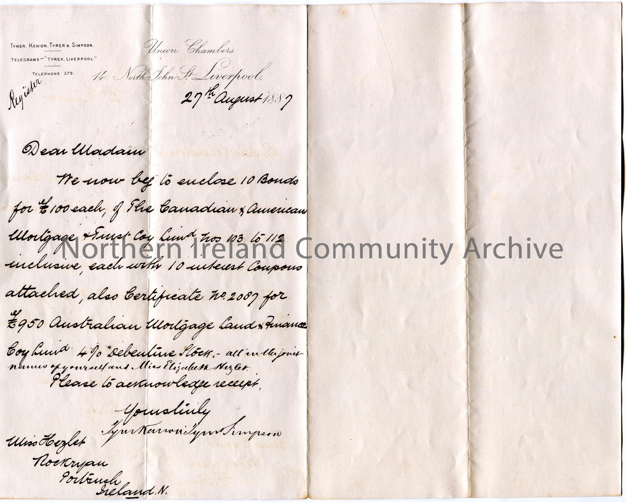 Handwritten letter to Miss Hezlet at Rockryan, Portrush, N.Ireland. Ten Bonds were enclosed for £100 each re the Canadian and American Mortgage and Trust Coy Fund? nos 103 to 112 and certificate for £950 Australian mortgage Laud and Finance Coy Fund in joint names of Miss Hezlet and Miss Elizabeth Hezlet.