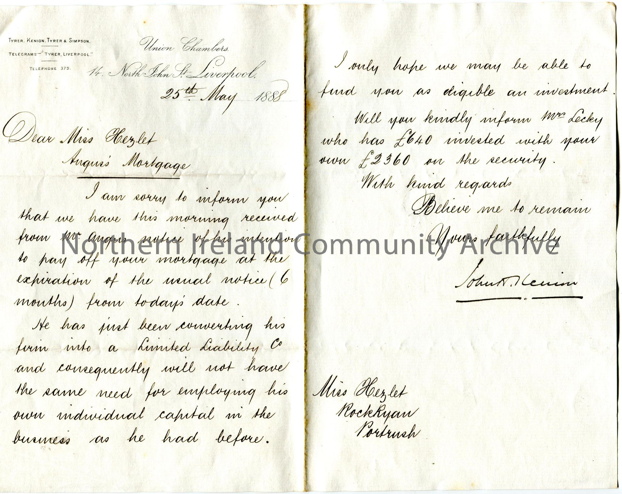 Handwritten letter to Miss Hezlet at Rockryan, Portrush. Writing re Angus' mortgage. Informs Miss Hezlet that Mr Angus intends to pay off the mortgage due to the conversion of his firm into a Limited Liability Company. Miss Hezlet to inform Mrs Lecky who has £640 invested along with Miss Hezlet's £2360.