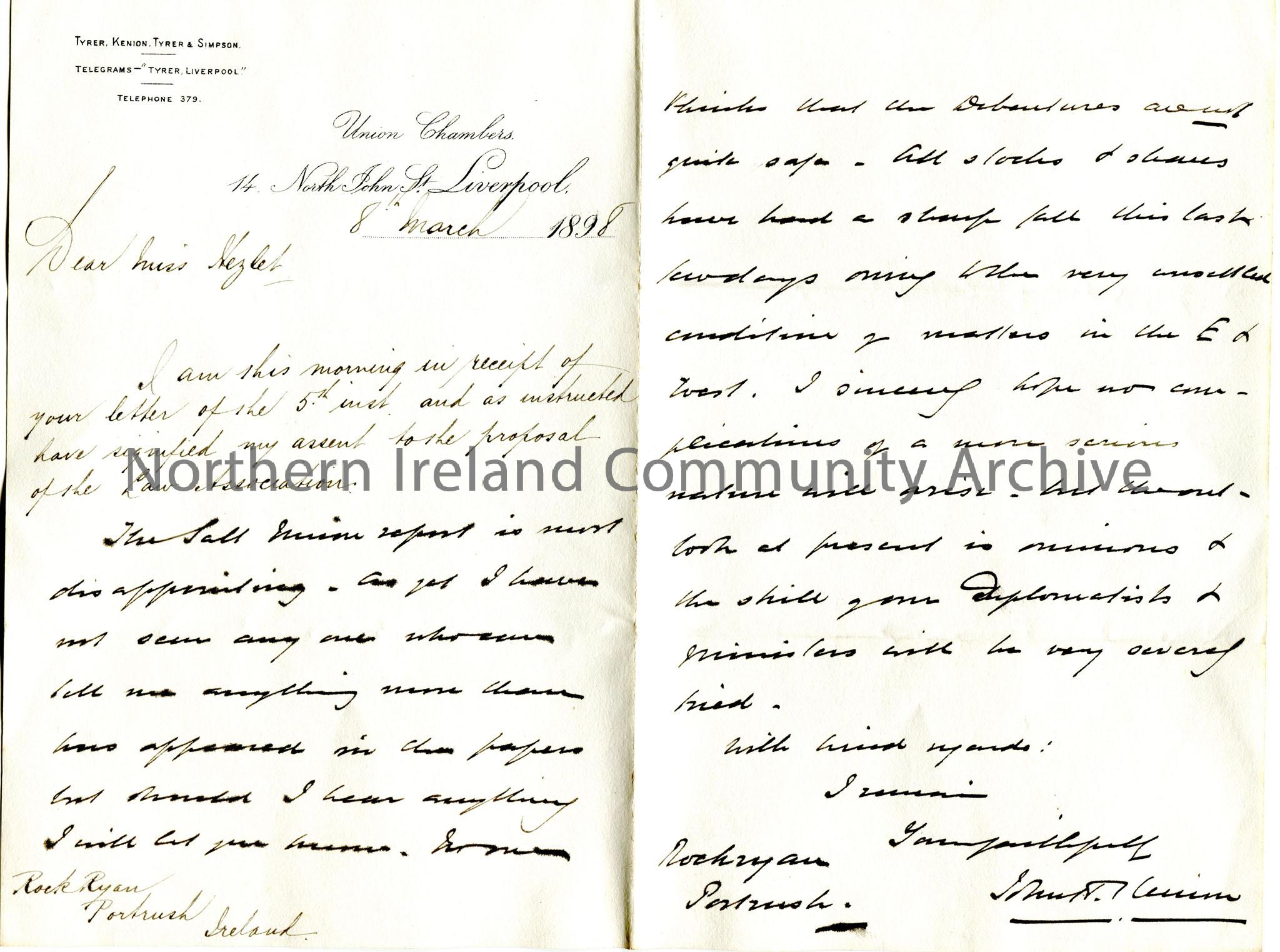 Handwritten letter to Miss Hezlet at Rockryan, Portrush. Writing re the Law Association and the conditions of the markets in the East and West.