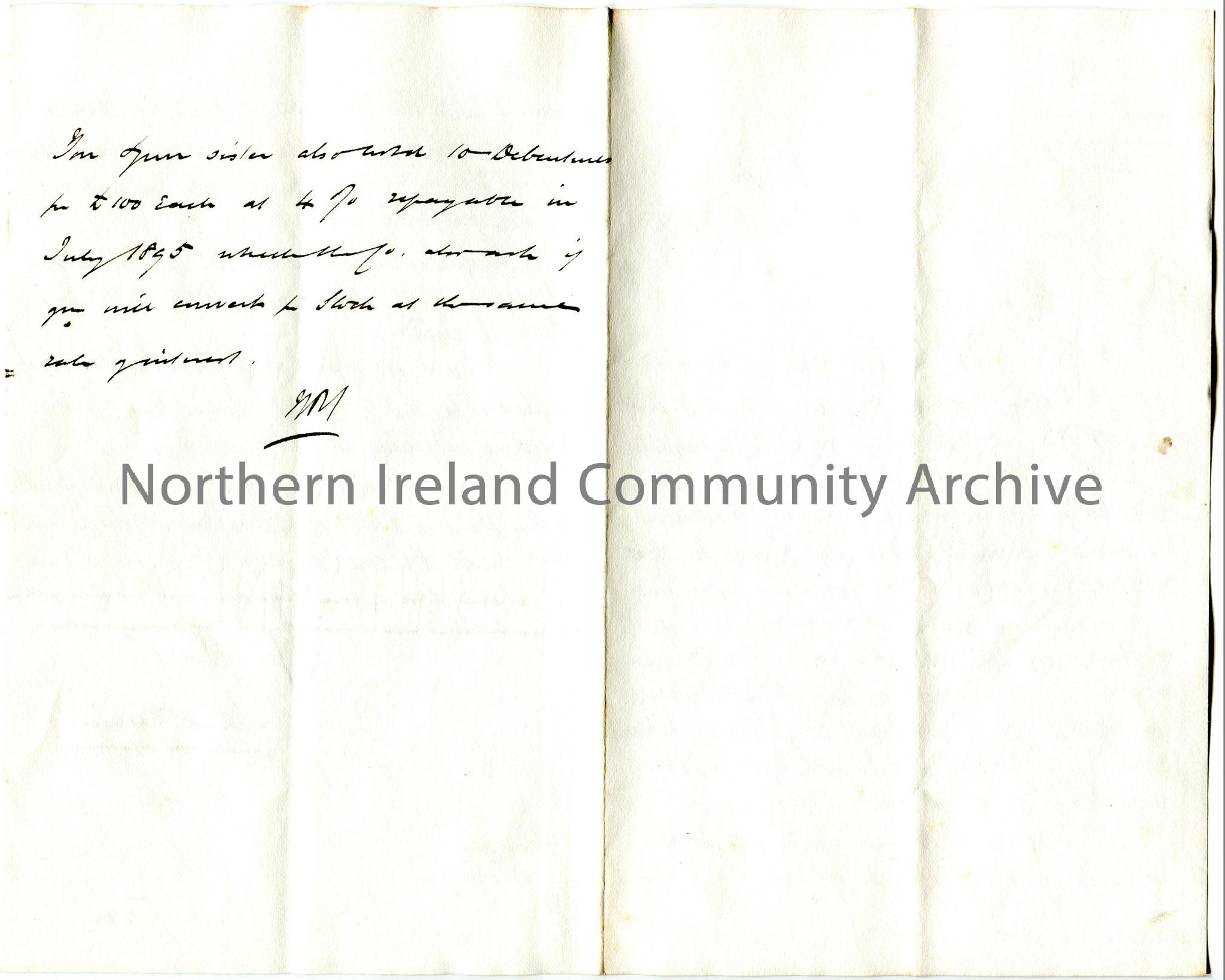 Handwritten letter to Miss Hezlet at Rockryan, Portrush. Writing re two debentures of the Canadian and American Mortgage and Trust Company Limited for £500 each of which Miss Hezlet is the holder. Note written on reverse states that Miss Hezlet's sister holds 10 debentures at £100 each. Signature illegible after note.