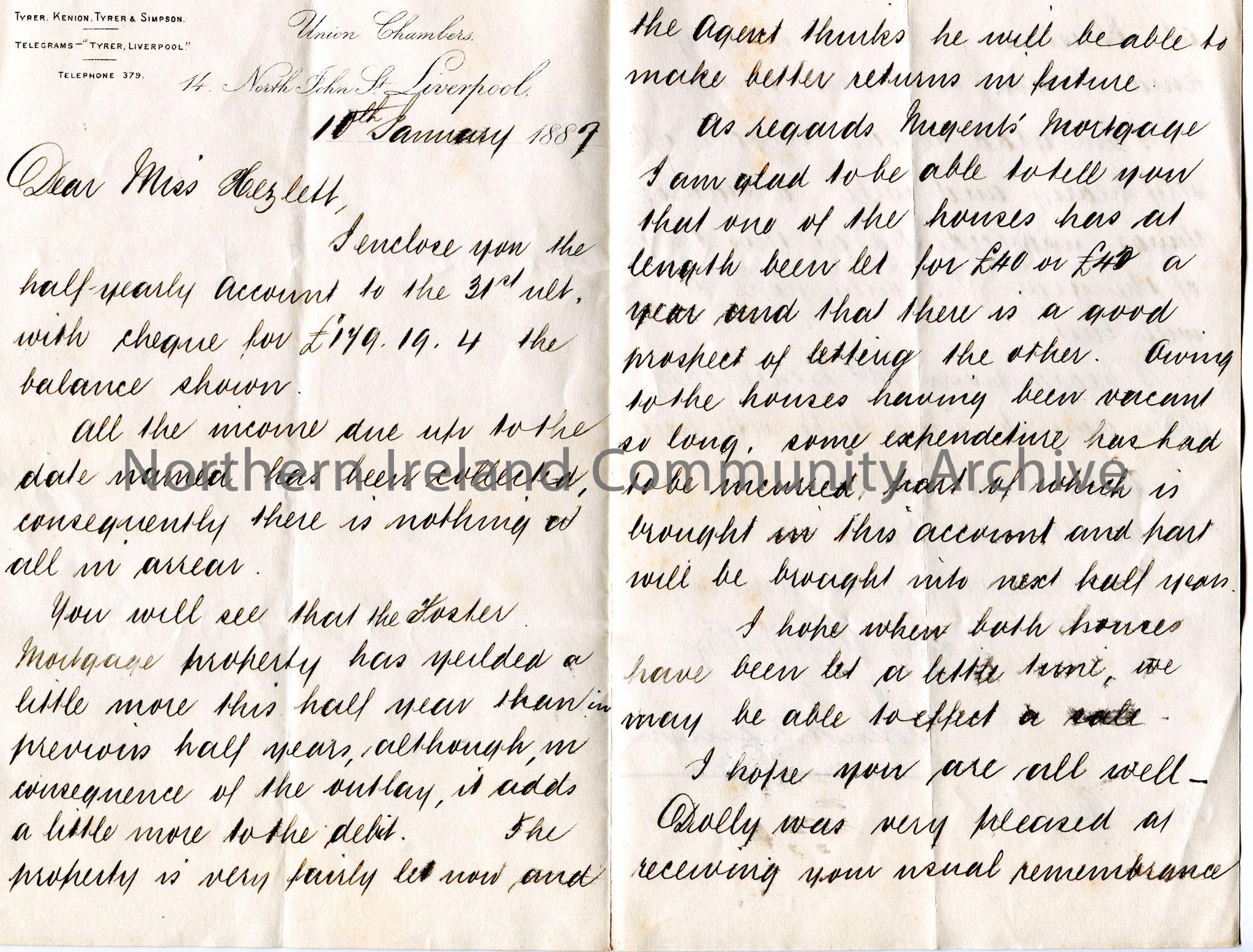 Handwritten letter to Miss Hezlet. Encloses half yearly statement of accounts and cheque for £179.19.4. Writes that the Foster mortgage has a higher yield than last year. A house has been let on Nugent's mortgage with hope that the other house will also be let. Gives thanks for sending remembrance to Dolly at Christmas. Mentioned that he heard from Mrs Leckie who is well.