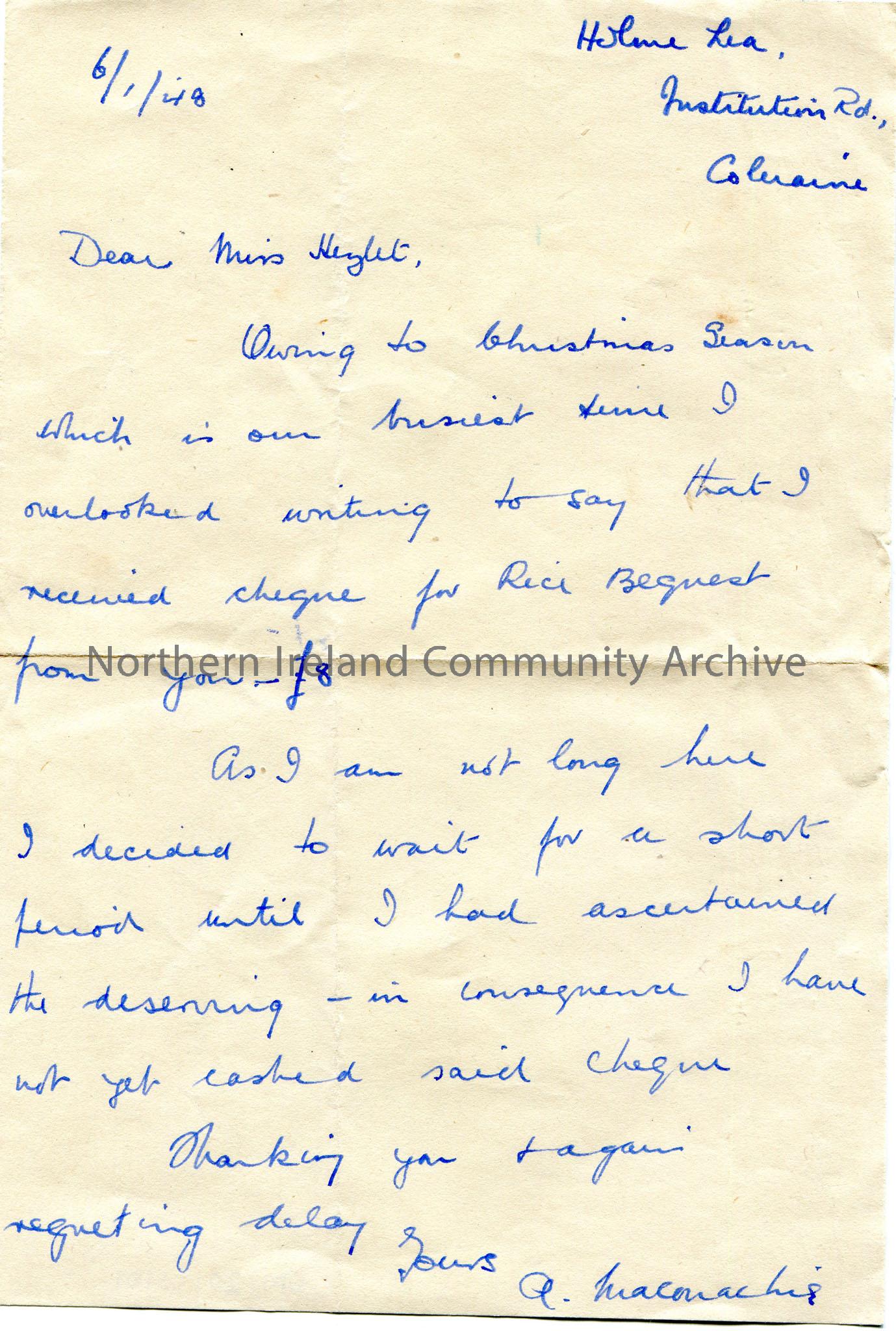 Handwritten letter to Miss Hezlet. Pays regrets in late reply to letter. Received cheque for £8 for Rice Bequest which has not yet been cashed.