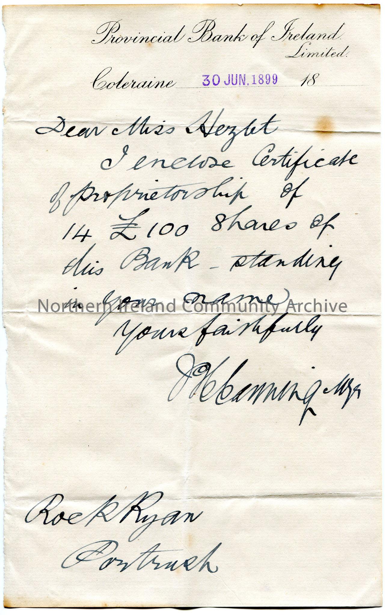 Handwritten letter to Miss Hezlet, Rock Ryan, Portrush. Encloses Certificate of proprietorship of 14 £100 shares in Miss Hezlet’s name.