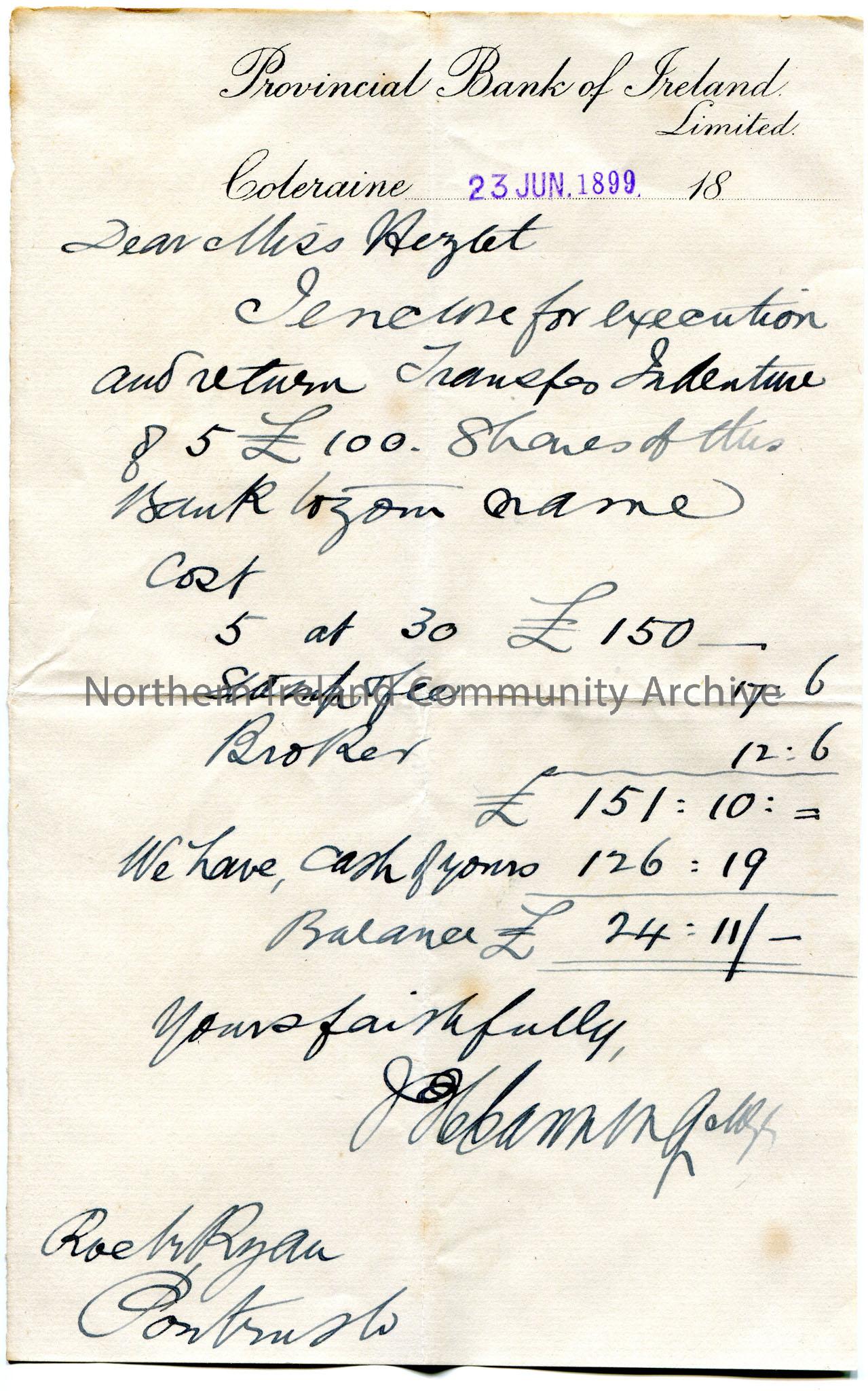 Handwritten letter to Miss Hezlet, Rock Ryan, Portrush. Encloses Transfer Indenture of 5 £100 for execution and return. Gives balance of £24:11/-.