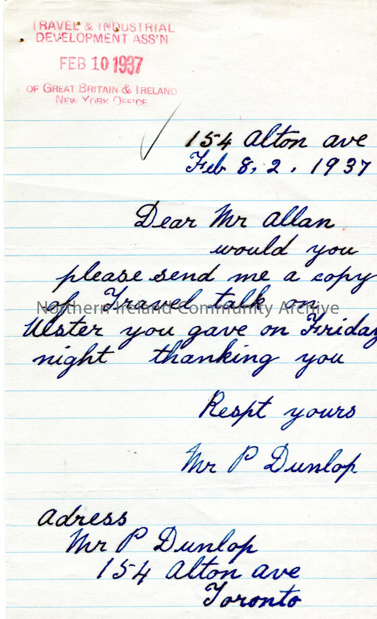 Handwritten letter to Mr Andrew Allan of Radio Station C.F.R.B. Toronto from Mr P Dunlop. Requesting a copy of the Travel Talk on Ulster given on Friday evening.