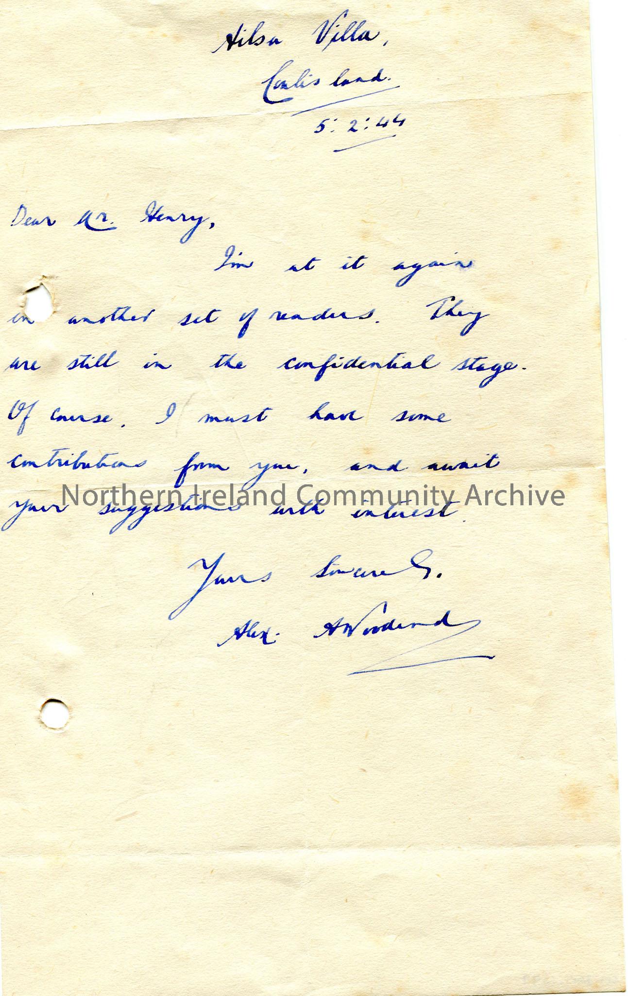 Handwritten letter to Mr Henry. Asking for contribution from Sam for suggestions of readers[?]. Writes that they are at ‘the confidential stage’.