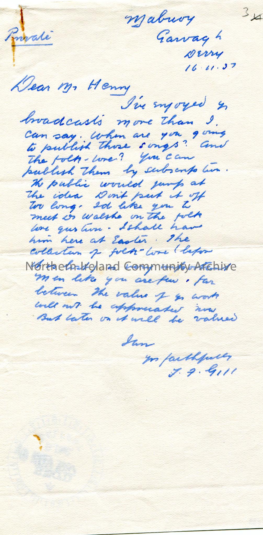 Handwritten letter to Mr Henry marked as 'Private'. Number '3' written at top corner in pencil. Writing to say they enjoyed the broadcasts. Asks if the songs and folklore are to be published. Would like Sam to meet Mr Walsh on the 'folklore question'. Encourages Sam to do so as they will be valued later on if not now. Received stamp of BBC Belfast 19th November 1937 on back of page.