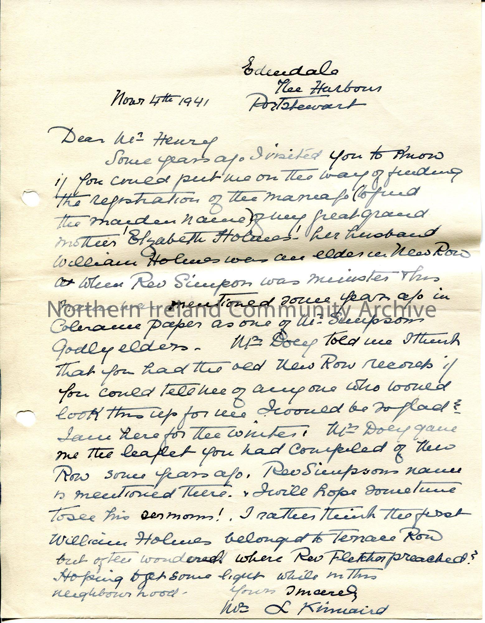 Handwritten letter to Mr Henry. They are searching for the maiden name of a relative - Elizabeth Holmes and need to search the old records of New Row [church]. Asks for Sam's help in searching the records. Writes that they are in Portstewart for the Winter.