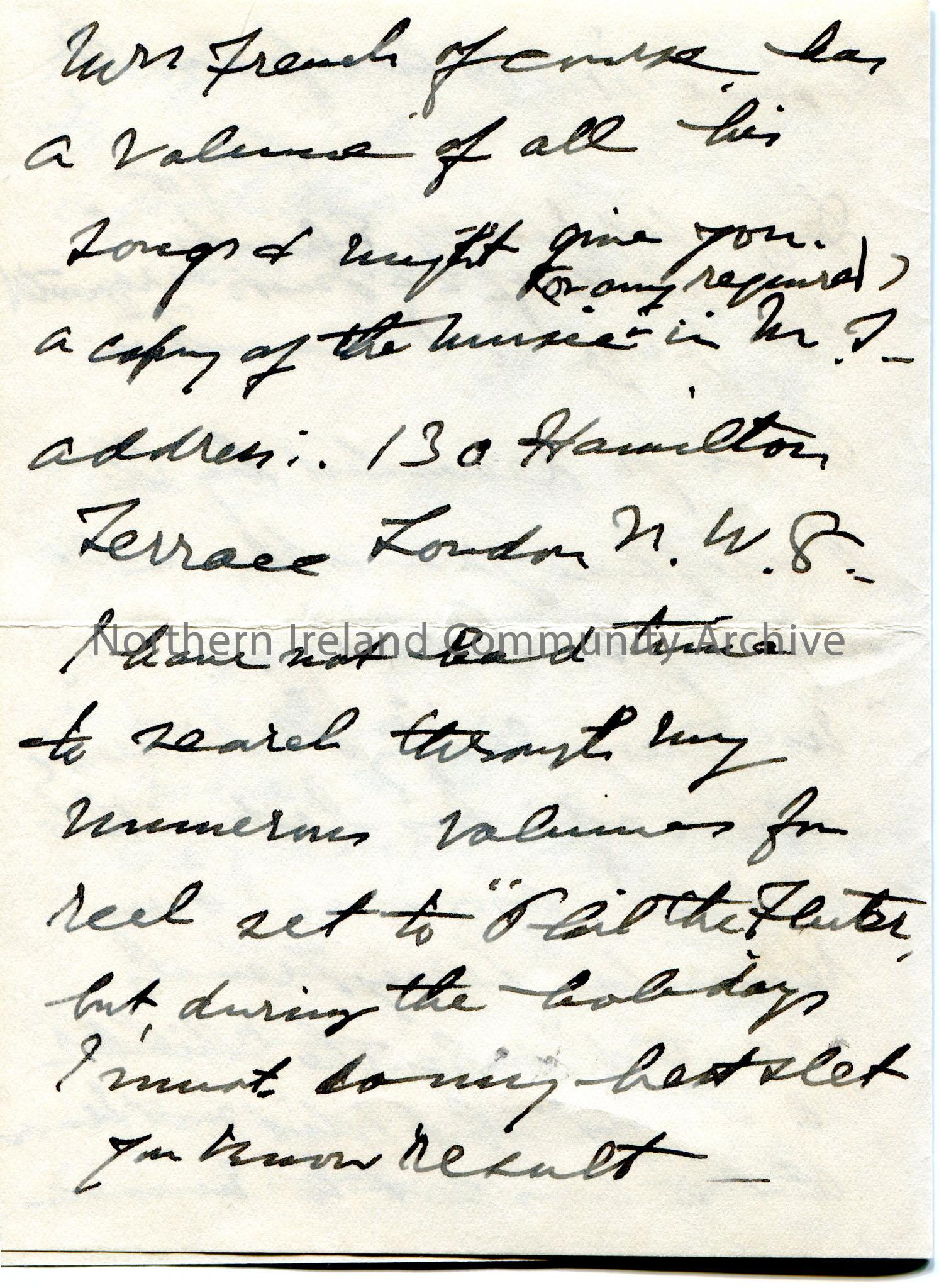 Handwritten letter to Mr Henry. Written on several sides of a folded page. Writing re 6 songs recorded by ? Gramophone Company. Mentions a song recited by Percy French. Gives Mrs French's contact details to contact re Percy French songs. Tells Sam re a book on the origins of 'The Fairy Reel'. Lists 6 songs after the end of the letter.