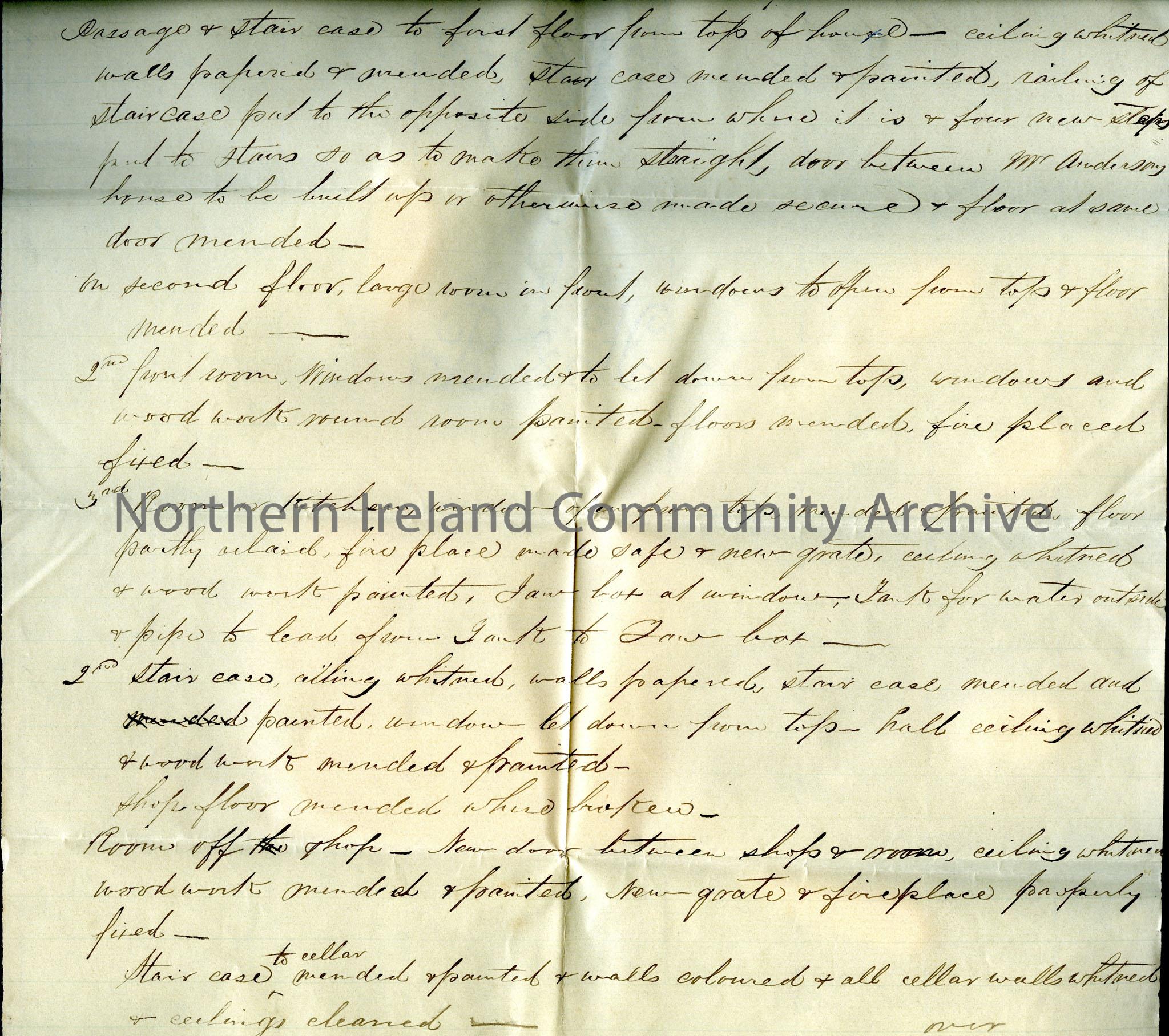 Handwritten letter to 'Mr. Hezlet' from 'John Moore(?)'. Letter is seeking approval from Mr. Hezlet for repairs to a property to be put up for rent. Letter includes lengthy details of the necessary repairs for each room of the house, stables etc. Letter sent from Coleraine.
