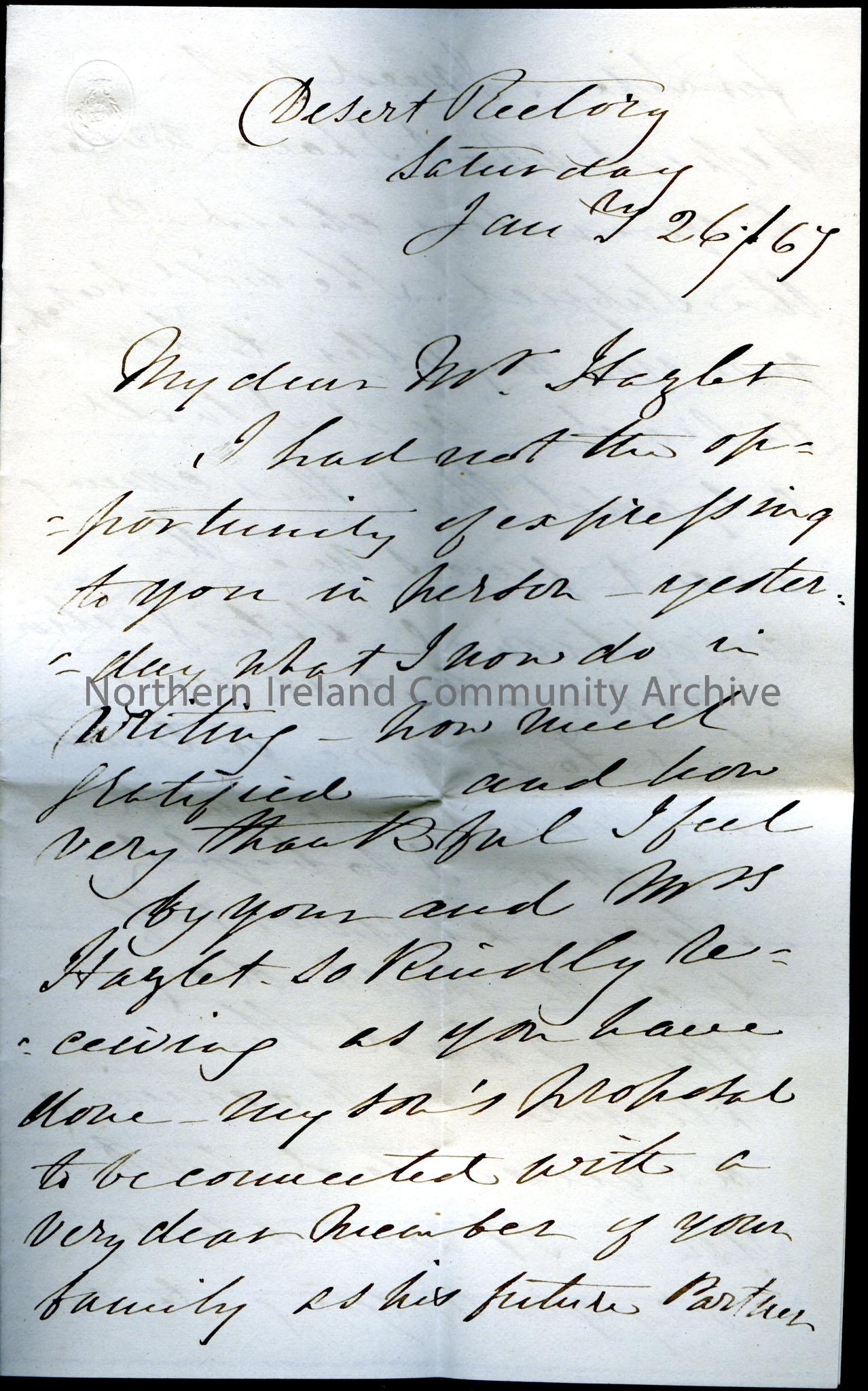 Handwritten letter to Mr. Hezlet (likely Robert). Sender discussing son's betrothal to a relative of Mr. Hezlet, likely a daughter: 'my son's proposal to be connected with a very dear member of your family as his future partner for life...'. Sender also gives their regards to 'Mrs. Hezlet'. Sender may be a member of the 'Gage' family, may be referring to marriage of Mark Gage and Arabella Hezlet.
