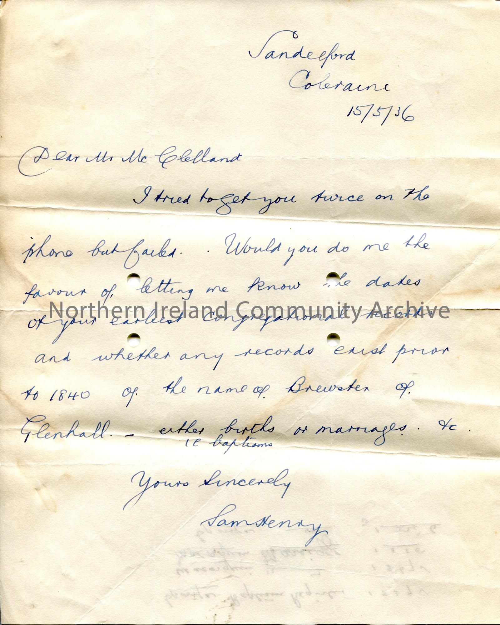 Handwritten letter to Mr McClelland from Sam Henry. Asks the recipient to search their Congregational records, births or marriages, for the name of Brewster of Glenhall pre 1840. List of registers in black ink on reverse, possibly written by the recipient. Mentions Macosquin and various 19th century dates.