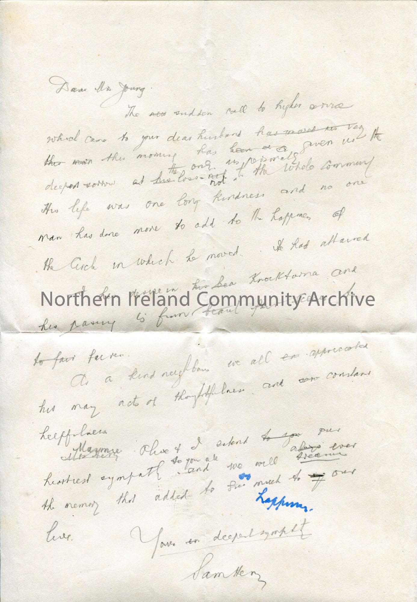 Handwritten letter to Mrs Young from Sam Henry. Written roughly and annotated throughout. [Possibly typed up and sent]. Sam gives sincere sympathies to Mrs Young on the death of her husband. Sam appears to have known the family very well.