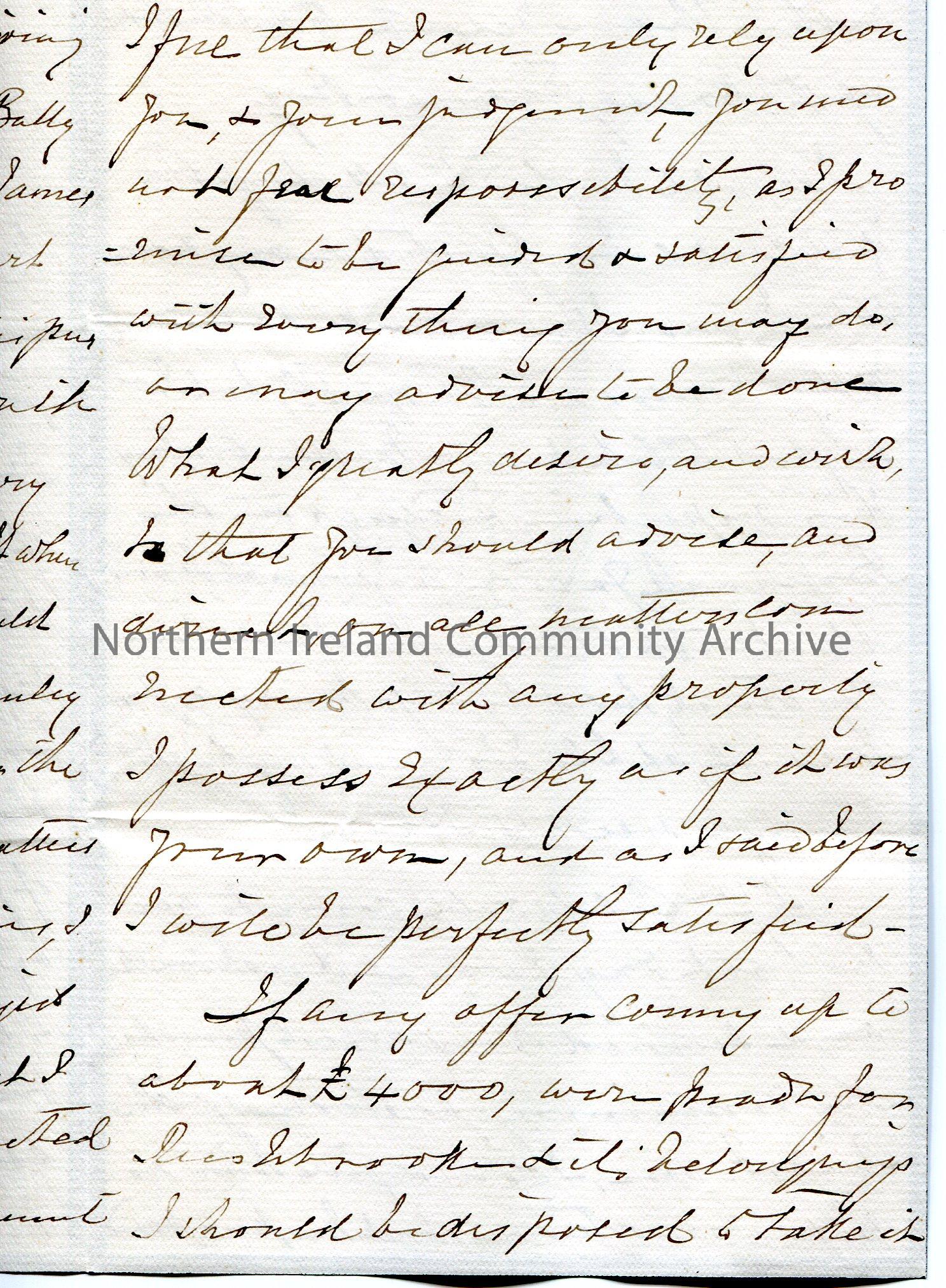 Handwritten letter to 'My Dear John'. (folded and written on three sides on mourning paper with black edging). End of letter missing. Mentions the sale of Rushbrooke and farm; house built by William Stewart, Blacksmith, near Garvagh and a second house improved by James MacDowell in Ballyquin. He has a mortgage on the latter house of £100. Asks John to give advice to Macauley in Coleraine on matter re property. He is willing to accept £4000 for the sale of Rushbrooke than it go auction. Mentions houses on Bridge Street and wishes to sell the house in Portrush which is tennanted by Miss Avery for £20. Writes that he is no good with property matters.
