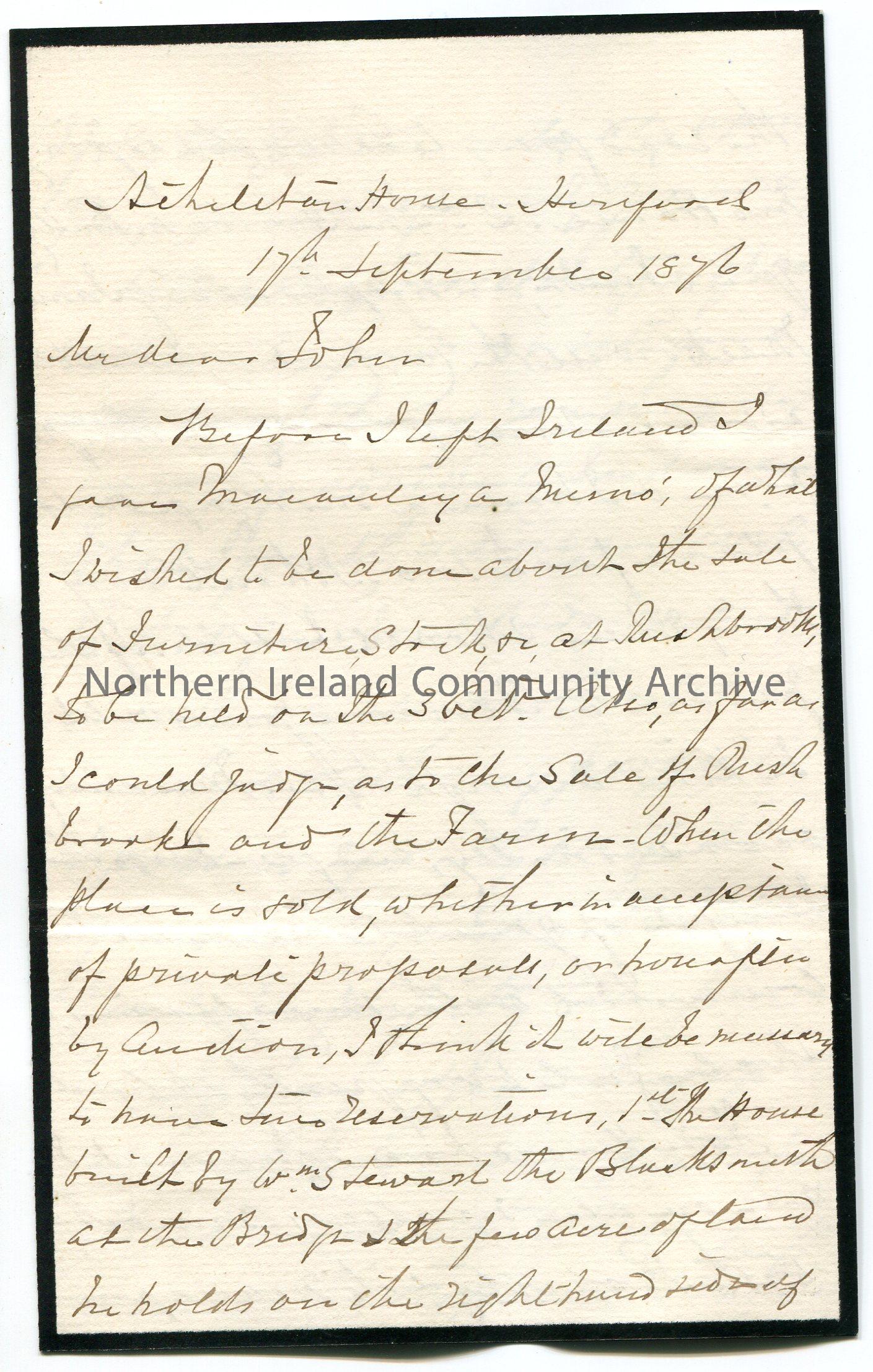 Handwritten letter to 'My Dear John'. (folded and written on three sides on mourning paper with black edging). End of letter missing. Mentions the sale of Rushbrooke and farm; house built by William Stewart, Blacksmith, near Garvagh and a second house improved by James MacDowell in Ballyquin. He has a mortgage on the latter house of £100. Asks John to give advice to Macauley in Coleraine on matter re property. He is willing to accept £4000 for the sale of Rushbrooke than it go auction. Mentions houses on Bridge Street and wishes to sell the house in Portrush which is tennanted by Miss Avery for £20. Writes that he is no good with property matters.