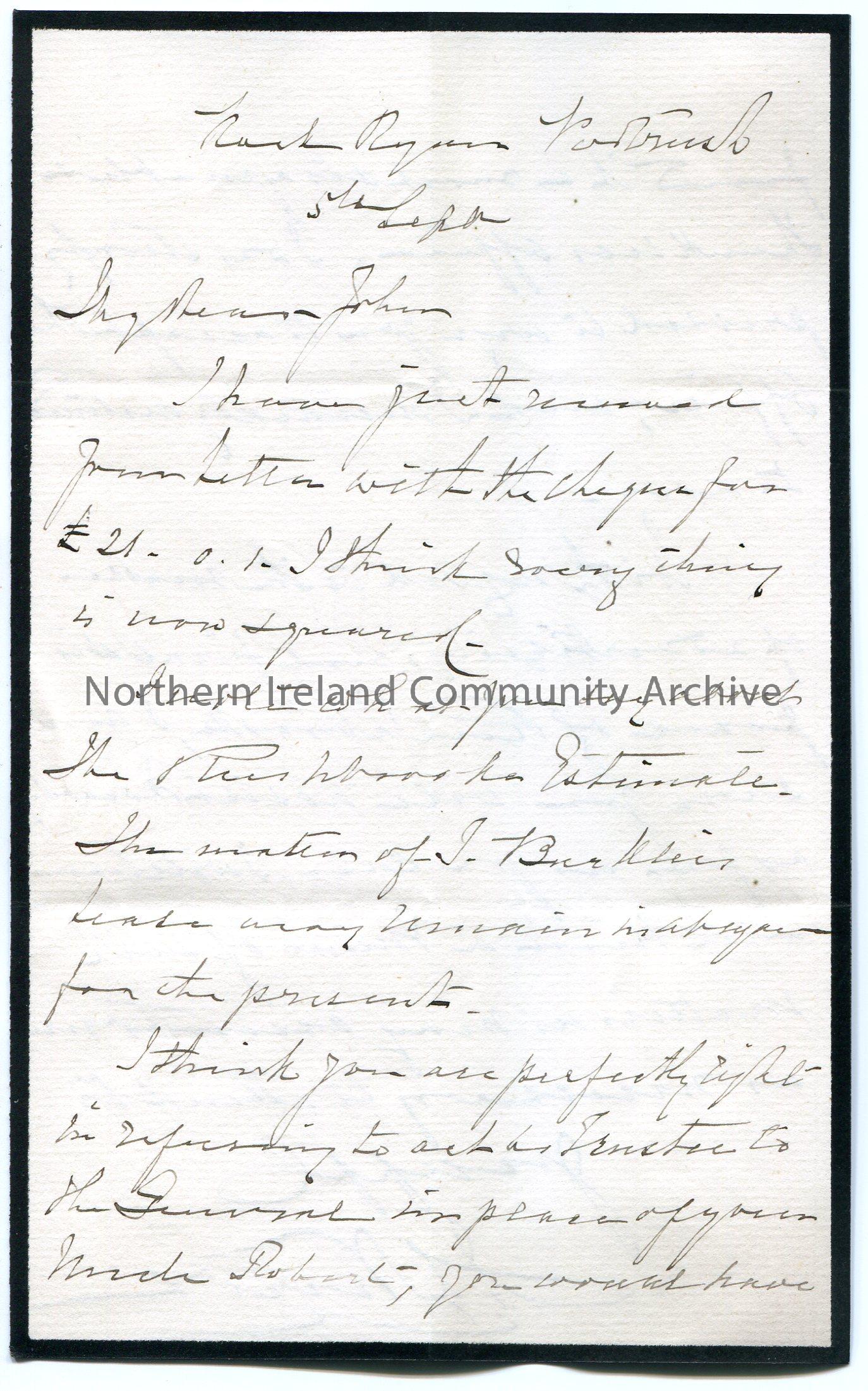 Handwritten letter to 'My Dear John'. (folded and written on three sides on mourning paper with black edging). Has received John's cheque for £21.0.1. Agrees that John was right to refuse to act as Trustee to the G? in place of his uncle Robert. Mentions Rushbrooke.