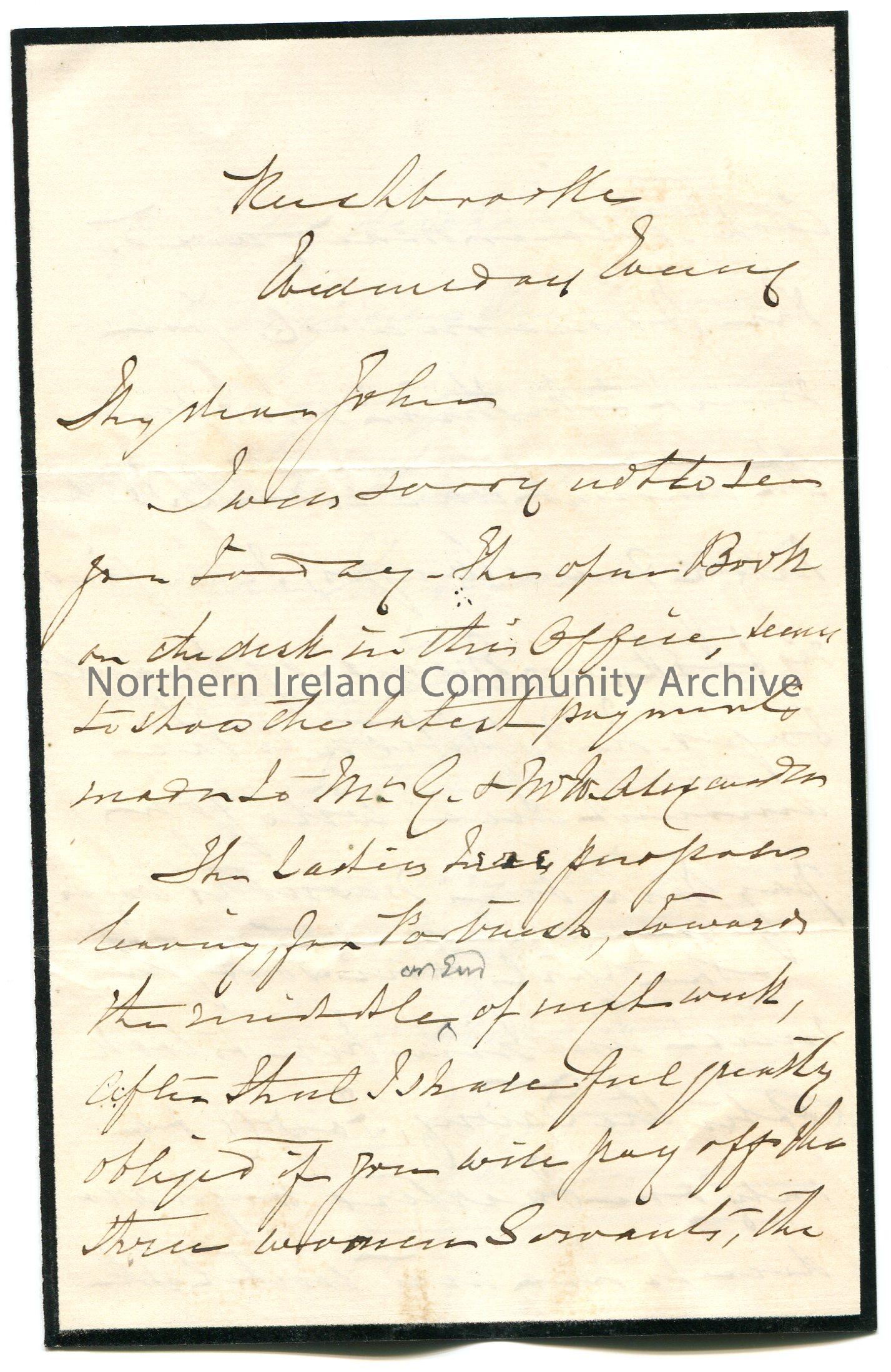 Handwritten letter to 'My Dear John'. (folded and written on three sides on mourning paper with black edging). Mentions leaving Portrush in the middle of next week. Asks for his wife to 'pay off' the 3 women servants, cook, ? and nursemaid. Mentions a Jane Forsyth.