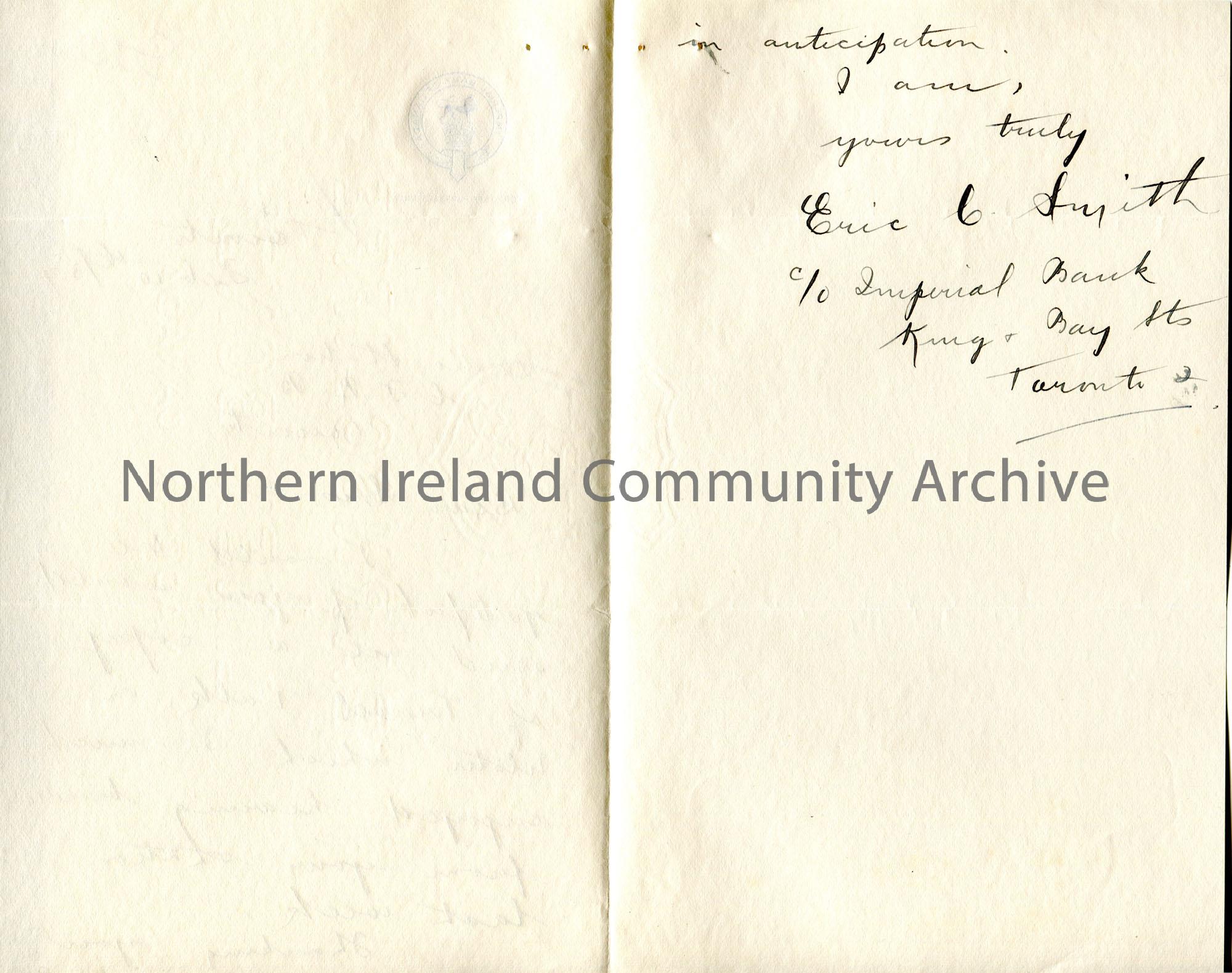 Handwritten letter to Radio Station C.F.R.B, Canada from Eric C. Smith. Requests a copy of the travel talk on Ulster which was broadcast in February 1… – Scan017B