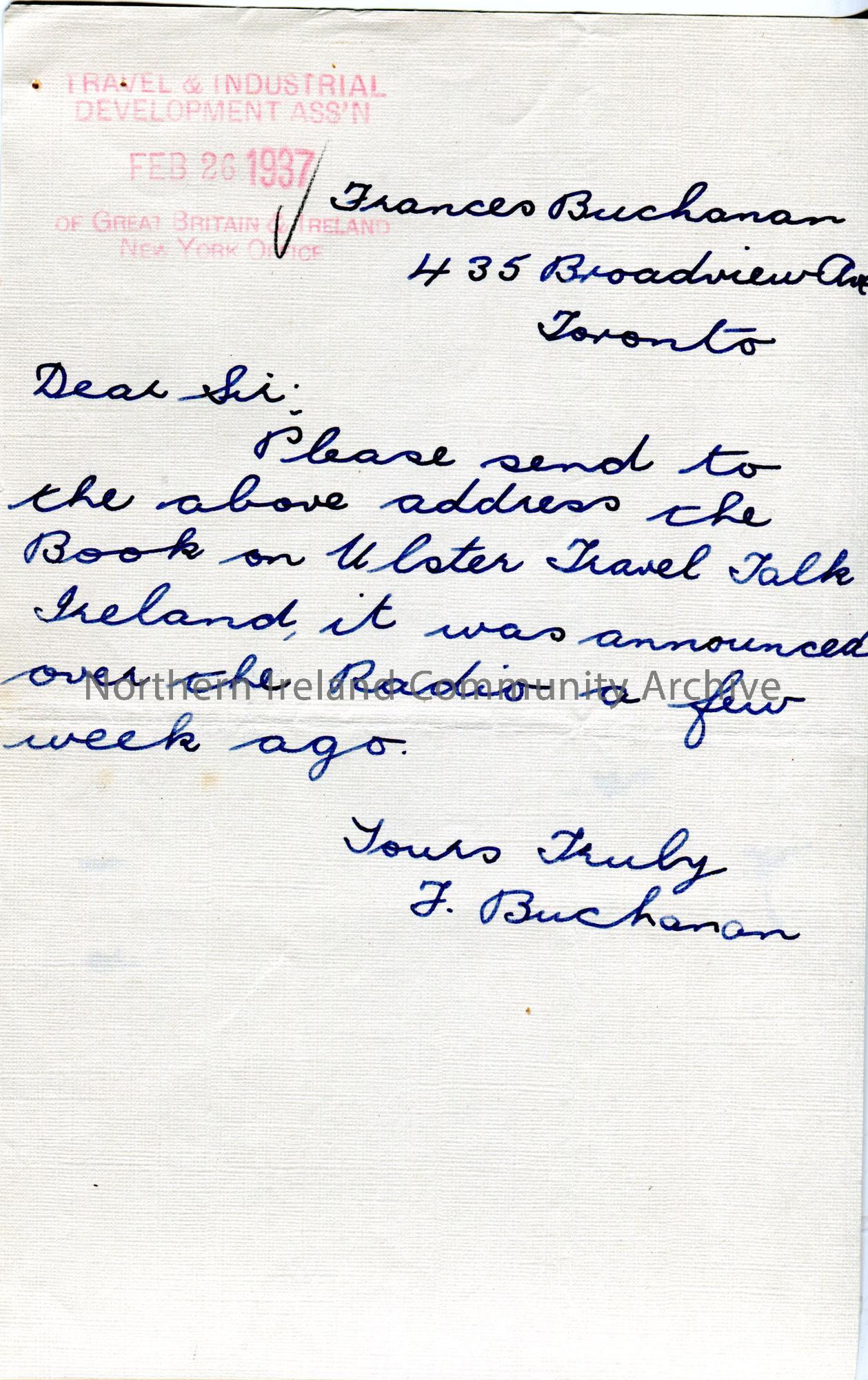 Handwritten letter to Radio Station C.F.R.B from F Buchanan. Requests a 'Book on Ulster Travel Talk Ireland' announced on the radio be sent to their address.
