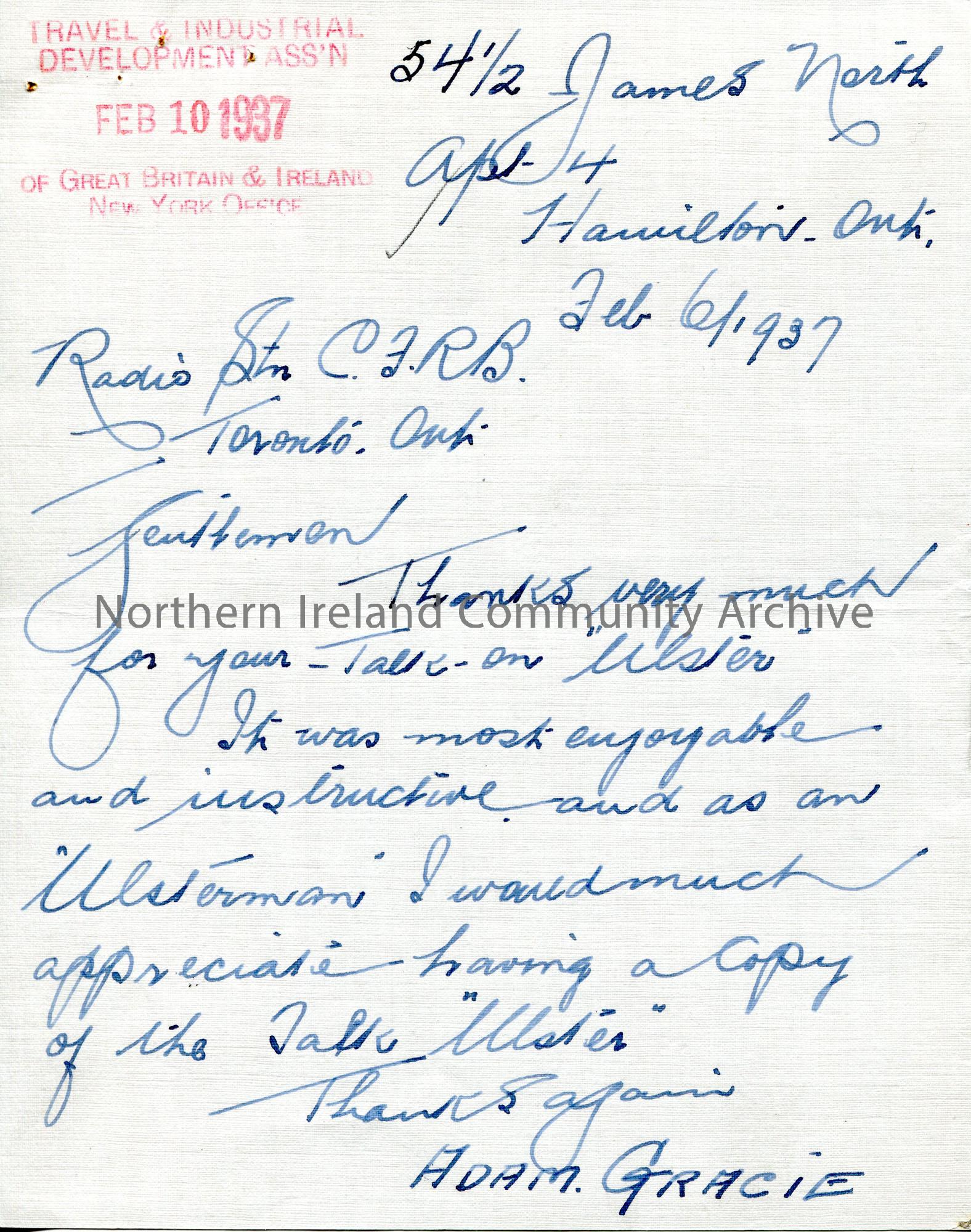 Handwritten letter to Radio Station C.F.R.B. Toronto from Adam Gracie. Requests a copy of a travel talk on Ulster. Notes that they are an ‘Ulsterman’ …