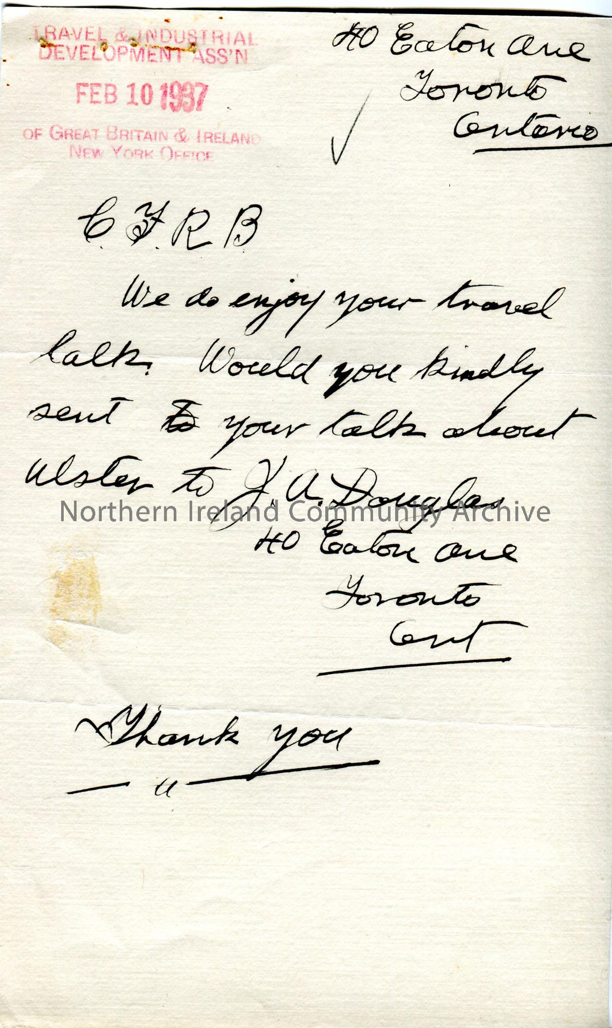 Handwritten letter to Radio Station C.F.R.B. Toronto from J. A. Douglas. Requests a copy of a travel talk on Ulster be sent to them.