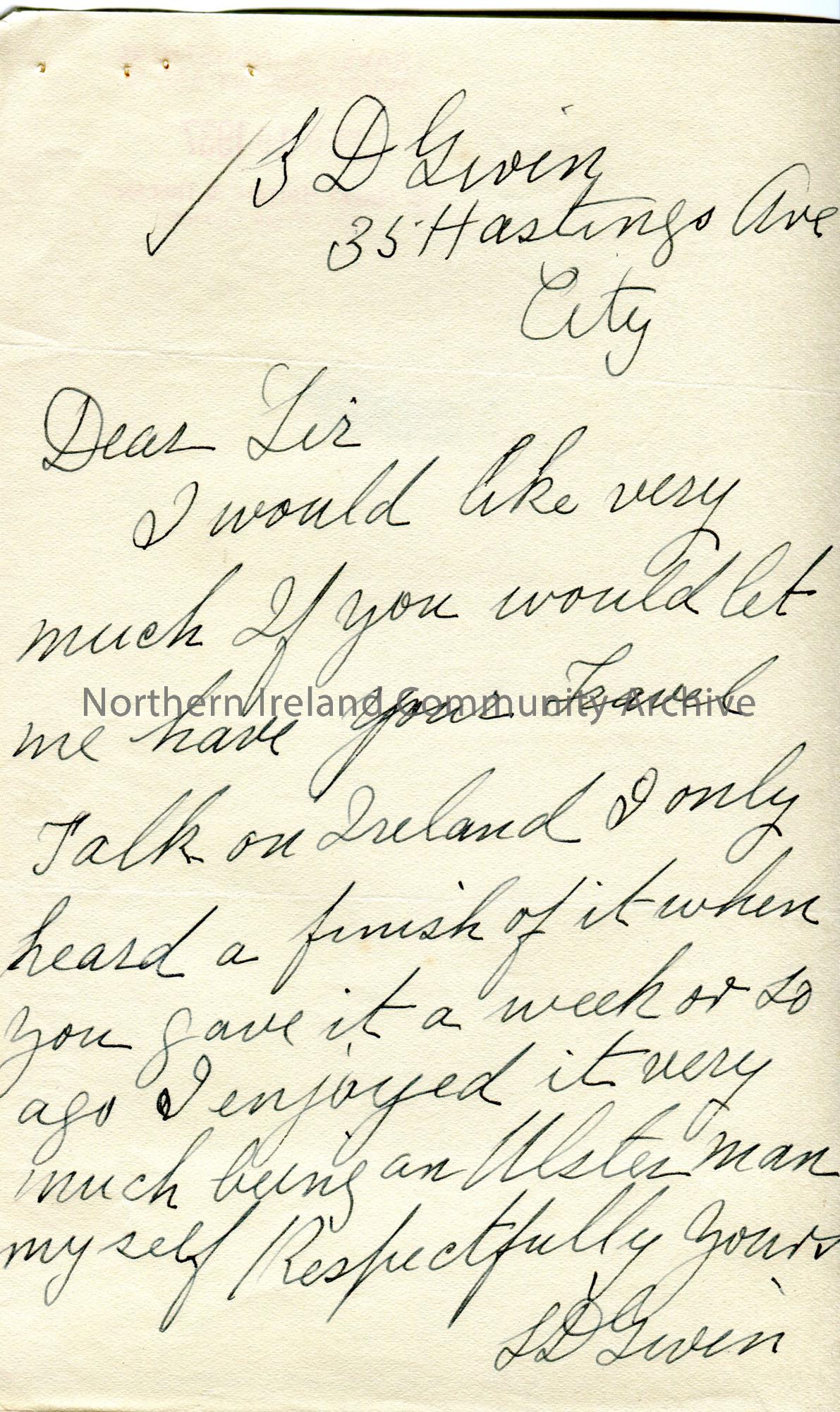 Handwritten letter to Radio Station C.F.R.B. Toronto from J D Given. Requests a copy of a Travel Talk on Ulster which was broadcast several days ago. They enjoyed the talk as they are an 'Ulsterman'.