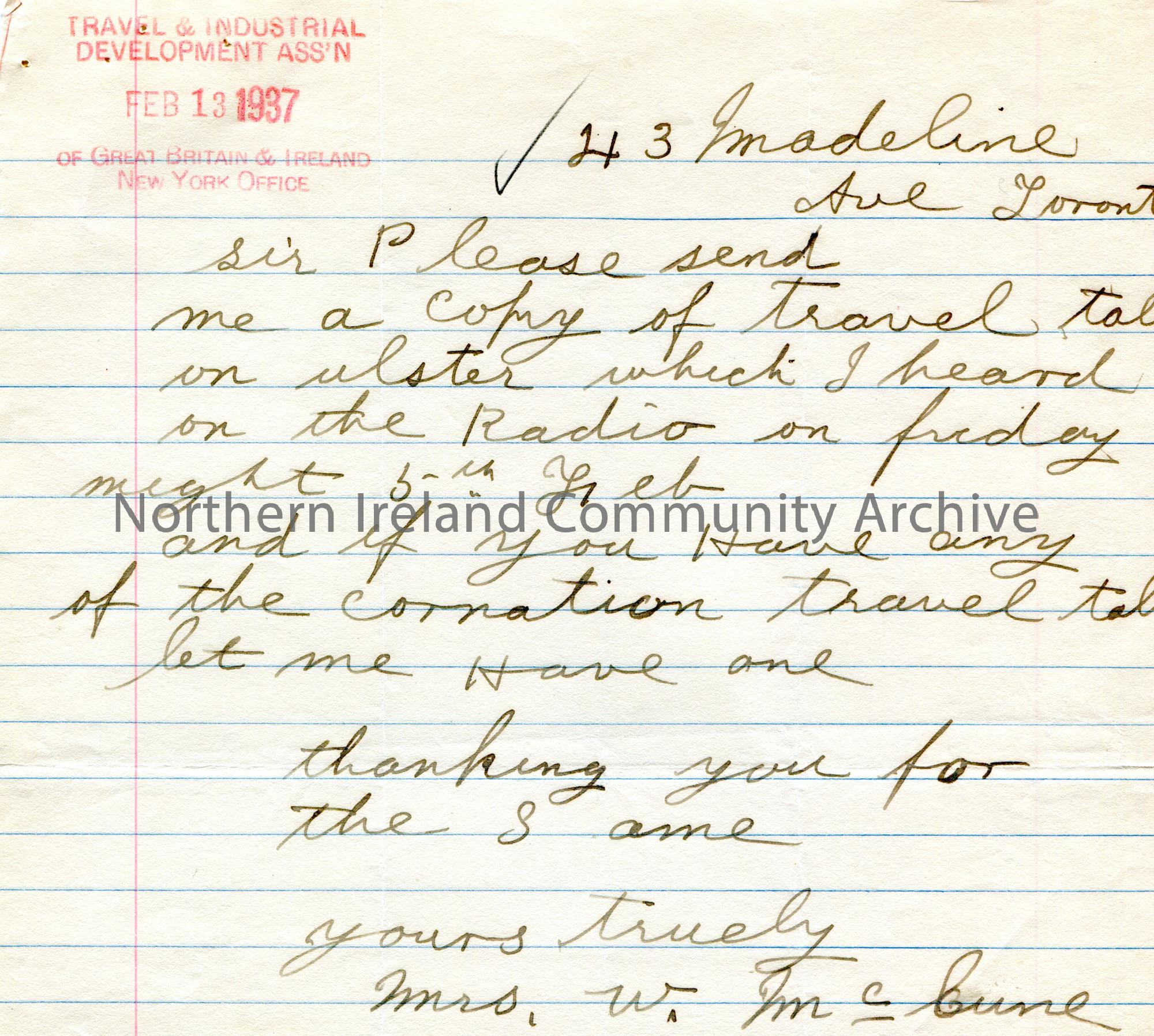 Handwritten letter to Radio Station C.F.R.B. Toronto from Mrs W McCune. Requesting a copy of a travel talk on Ulster broadcast on 5th February 1937 as well as one of the 'cornation travel talks'.