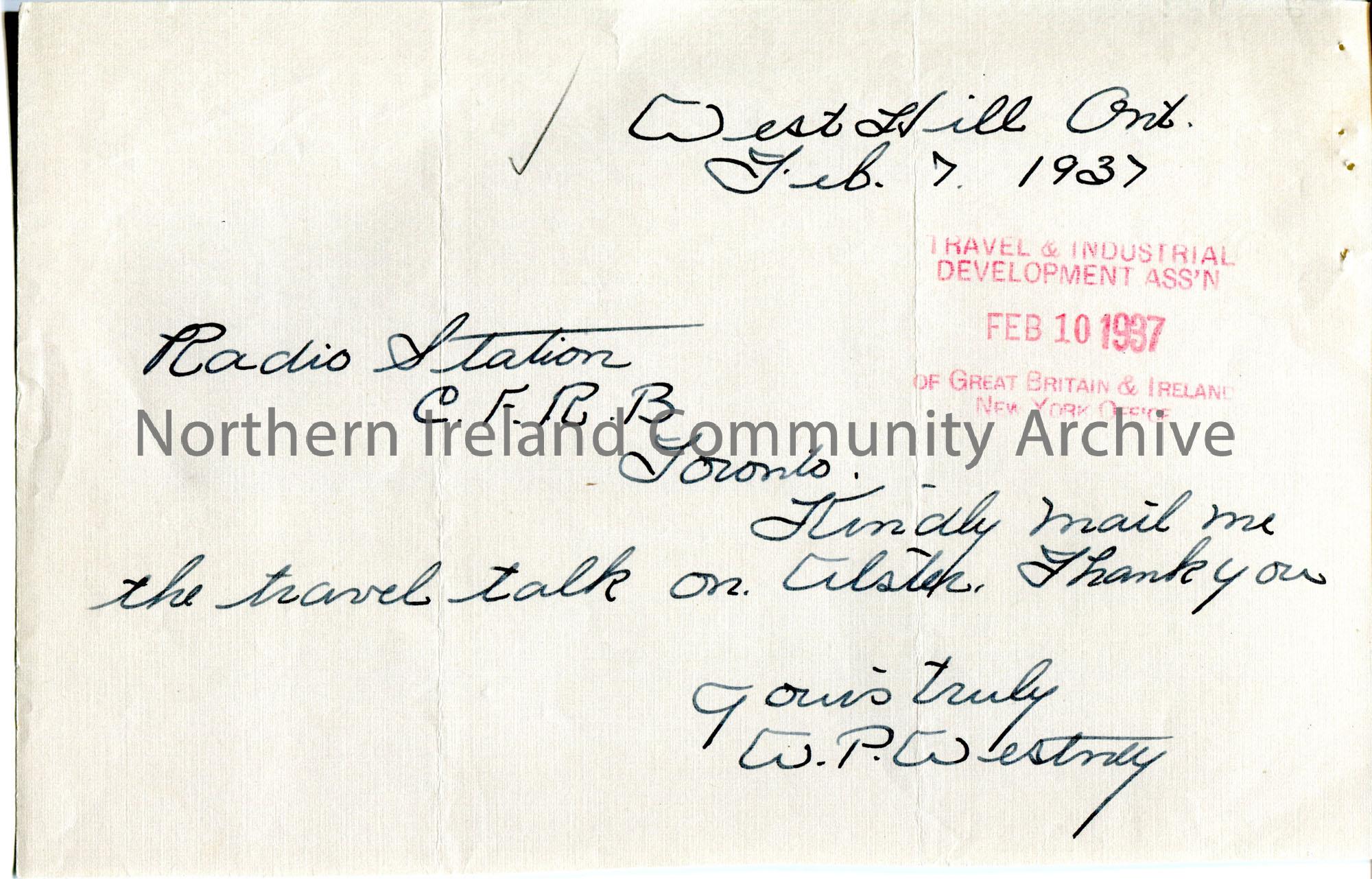 Handwritten letter to Radio Station C.F.R.B. Toronto from W. P. Westray requesting a copy of a Travel Talk on Ulster.