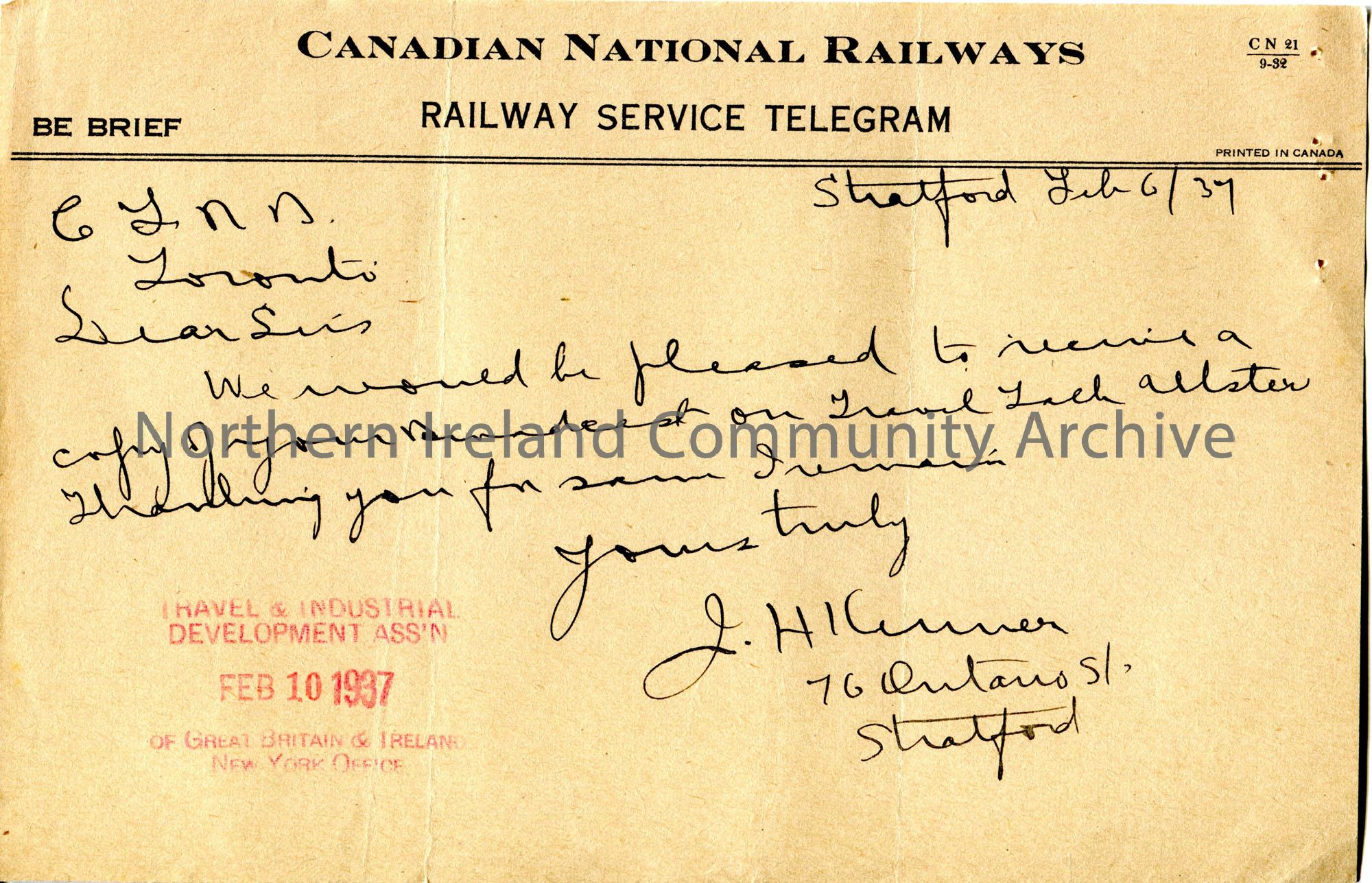 Handwritten letter to Radio Station C.F.R.B. Toronto requesting a copy of a Travel Talk on Ulster.