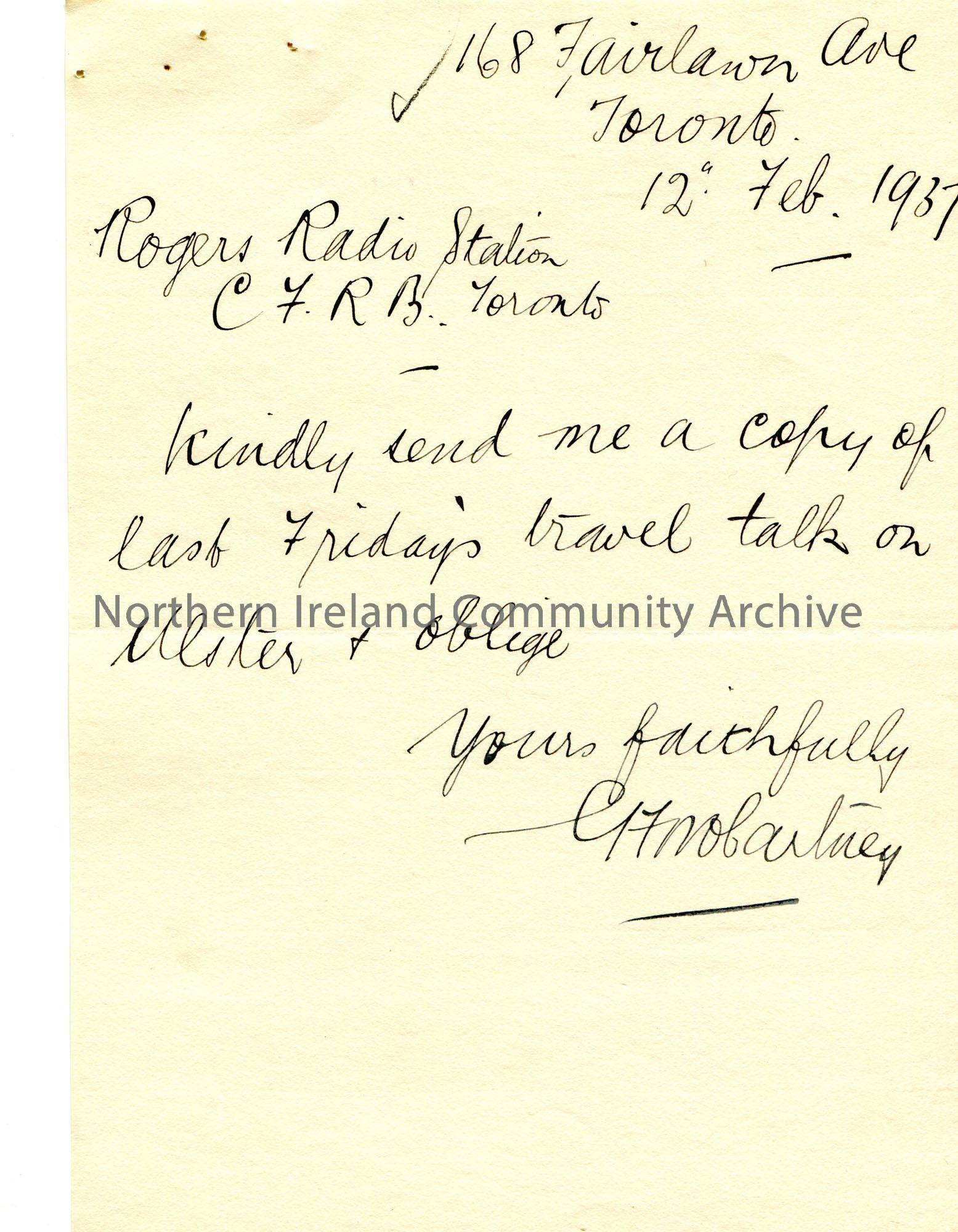 Handwritten letter to Rogers Radio Station C.F.R.B. Toronto from C McCartney. Requesting a copy of a travel talk on Ulster broadcast on 5th February 1937.