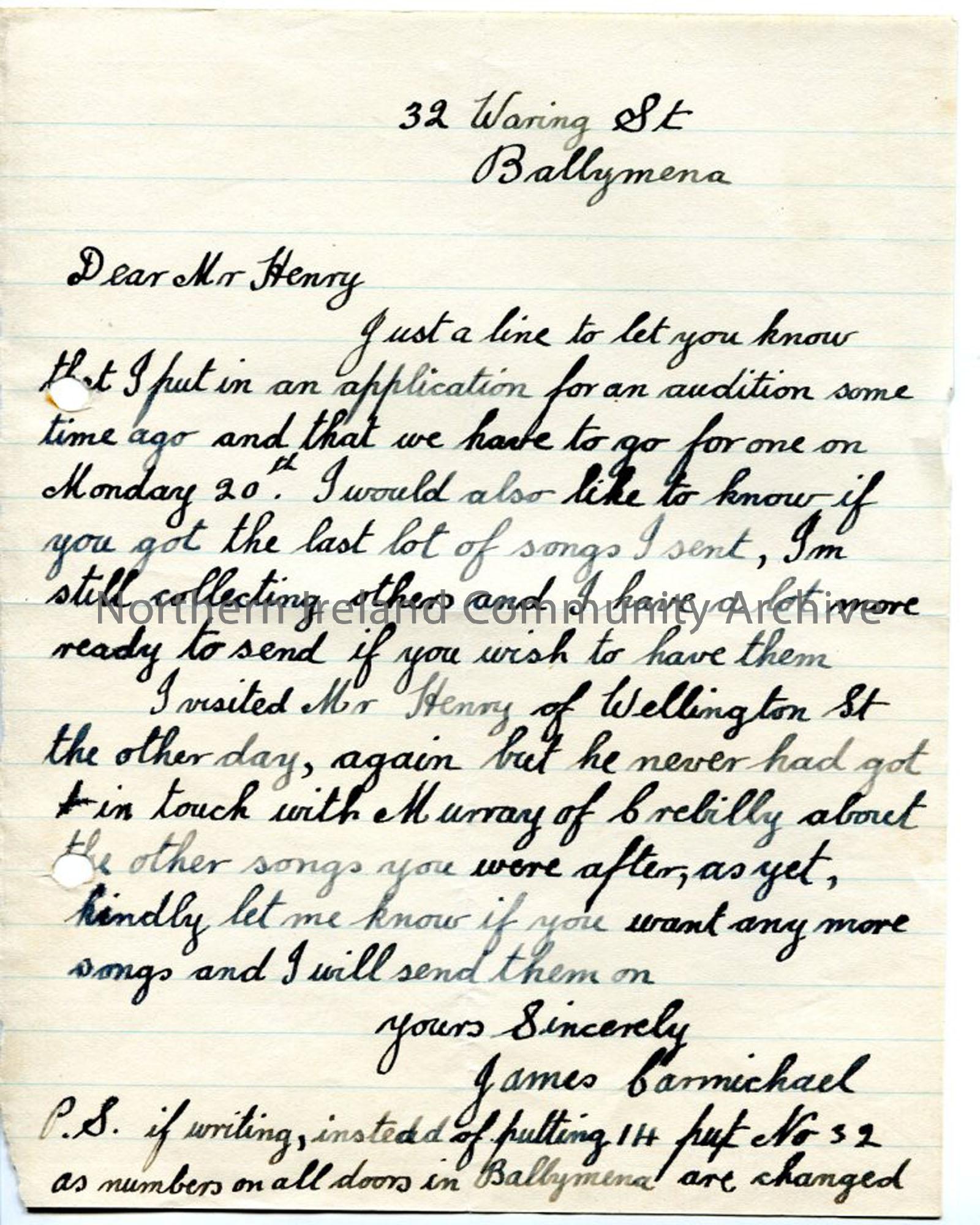 Handwritten letter re song collecting and having to go to BBC for audition. Refers to change of house number being due to all houses in Ballymena being changed. Author Carmichael, James.