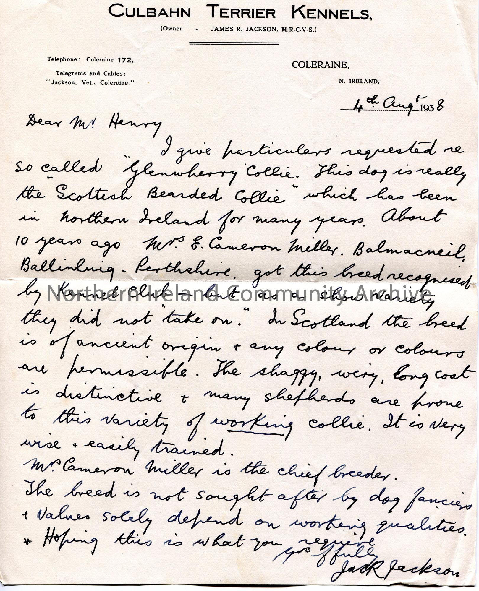Handwritten letter to Sam Henry. Answering Sam’s query re the Glenwherry Collie dog.