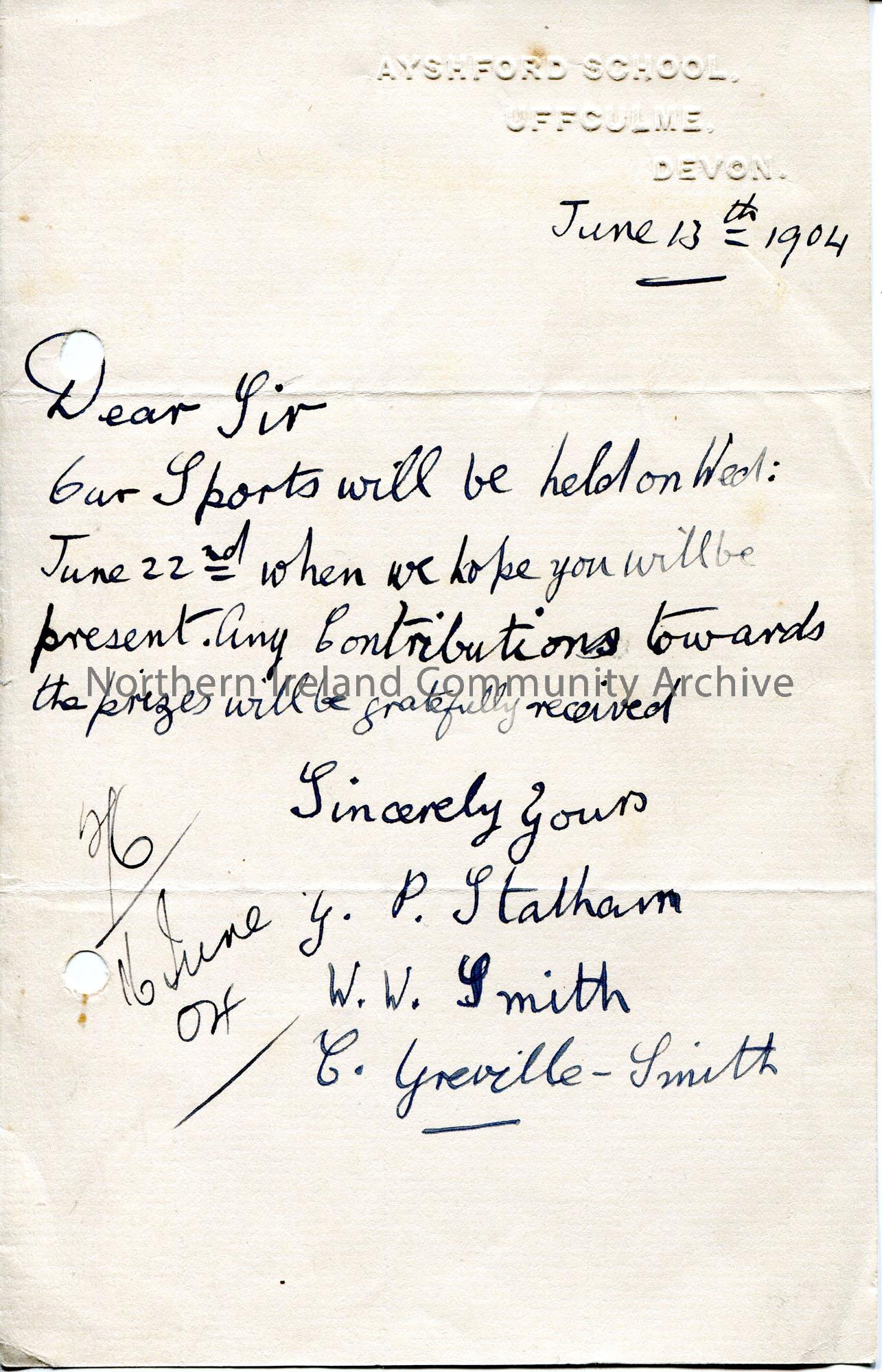 Handwritten letter to Sam Henry. Asks for contributions towards sports prizes at Ayshford School, Uffculme, Devon.