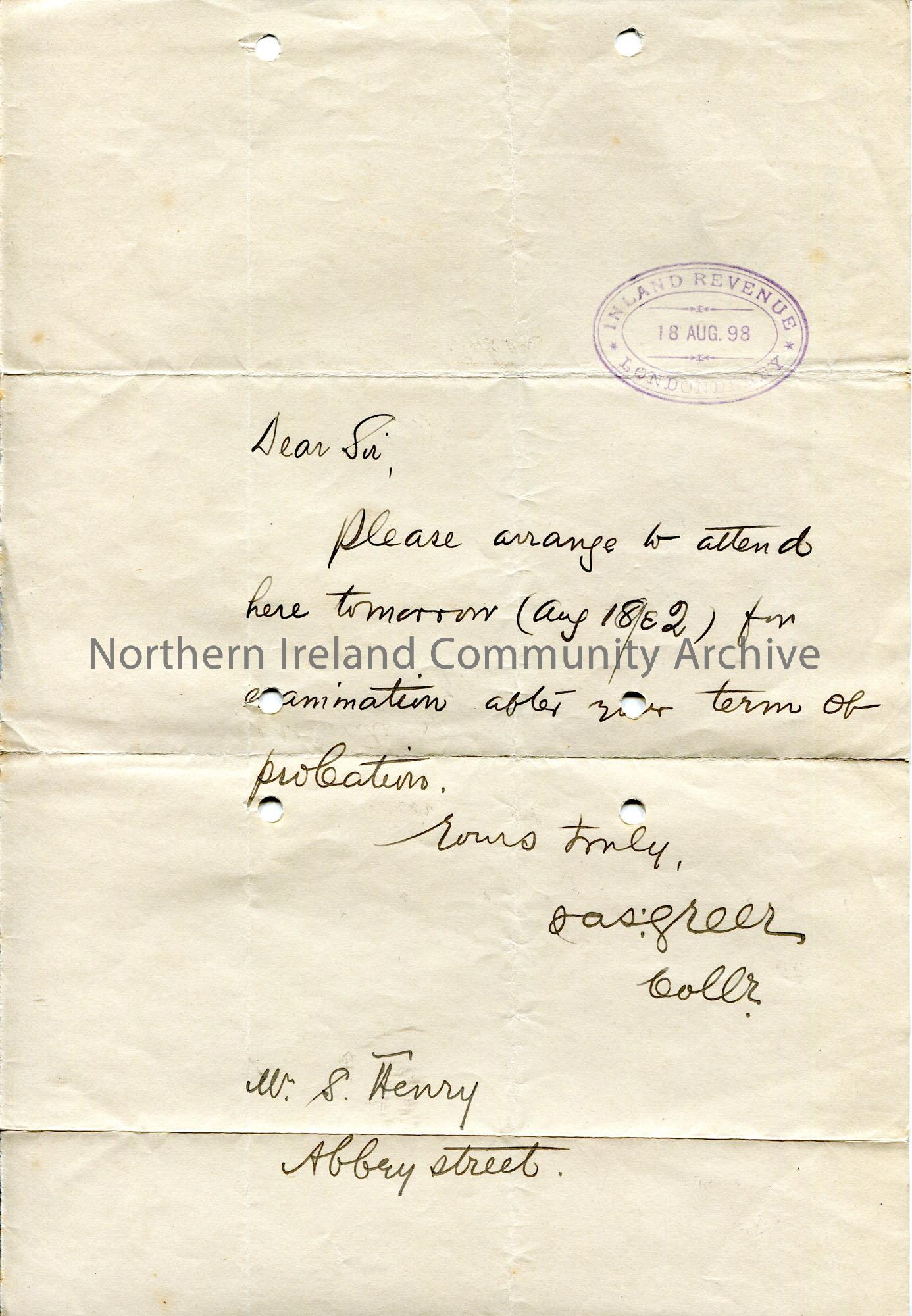 Handwritten letter to Sam Henry at Abbey Street [Coleraine]. Sam to attend examinations after his term of probation.