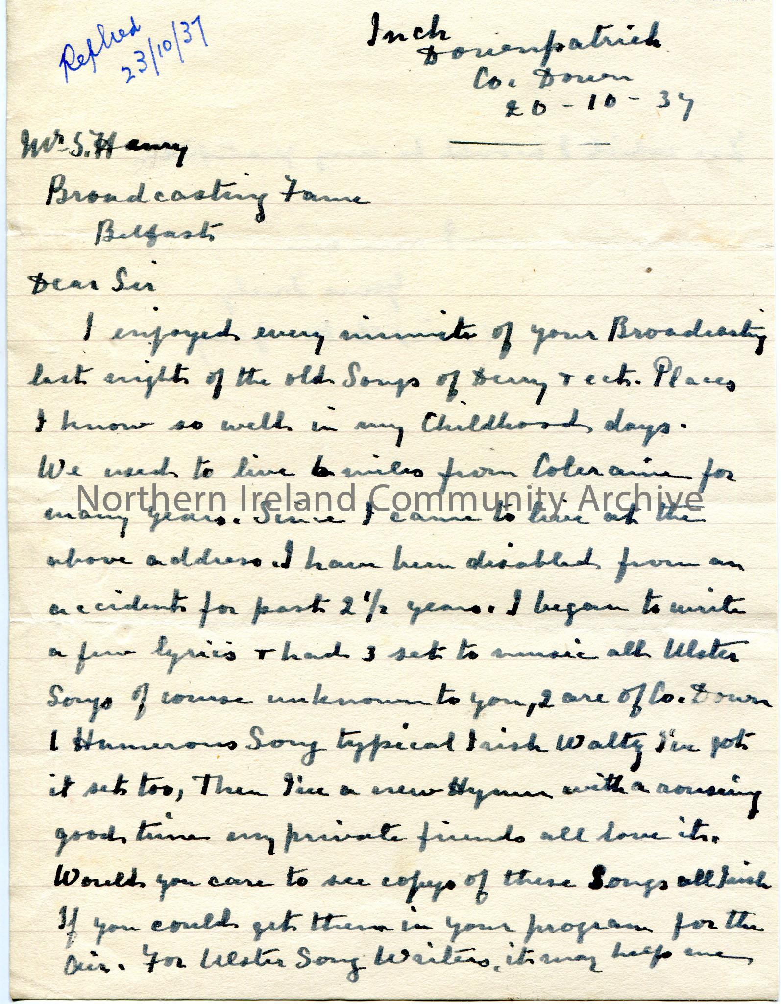 Handwritten letter to Sam Henry, Broadcasting House, Belfast. 'Replied 23/10/37' written at top of page. Writing re Sam's broadcast re old songs of Derry last night. States that they used to live 6 miles from Coleraine and have been disabled for the past 2 1/2 years. They have written 3 songs, 2 of which are re County Down. Would like Sam to put them in a programme.