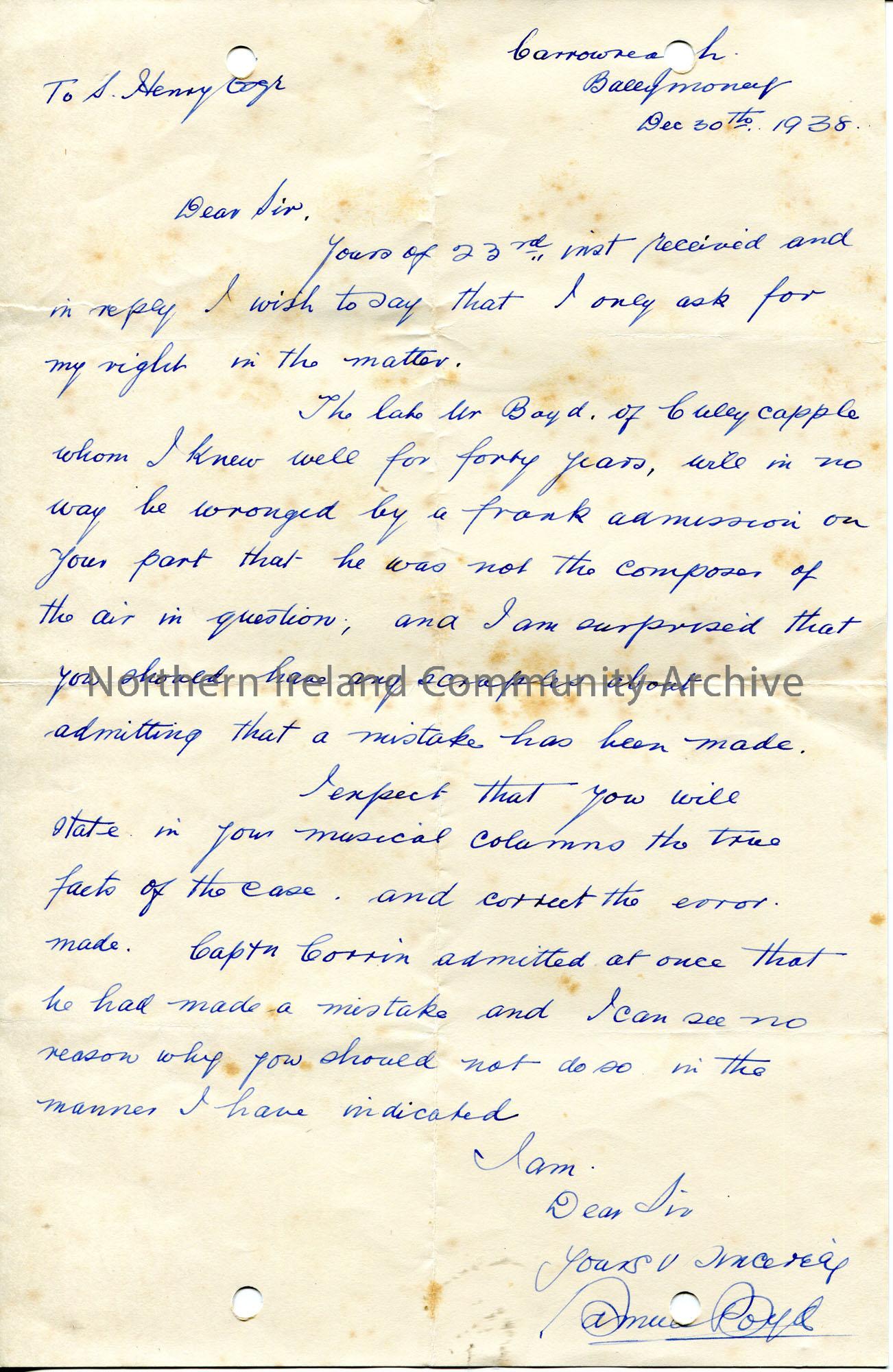Handwritten letter to Sam Henry. Calls for Sam to correct an error re the composer of a song which they claim Sam has stated the wrong person. Mentions Mr Boyd of Cullycapple.